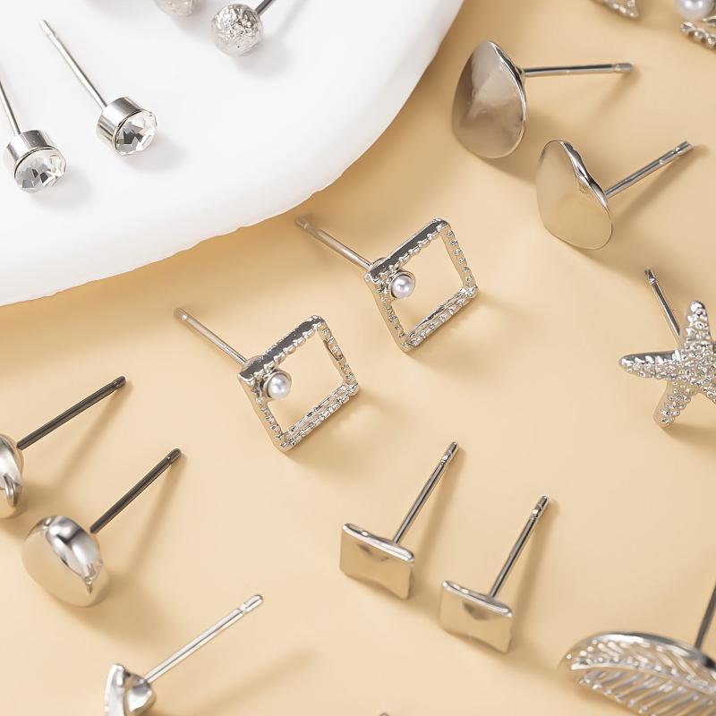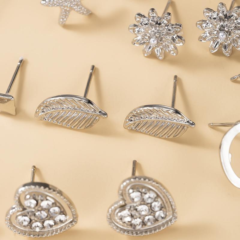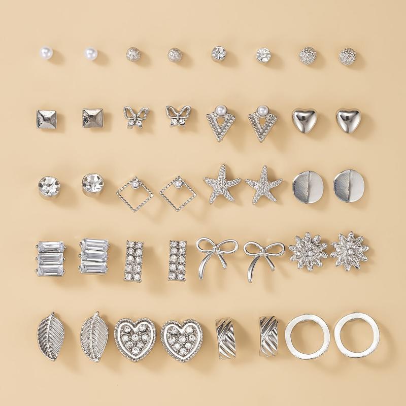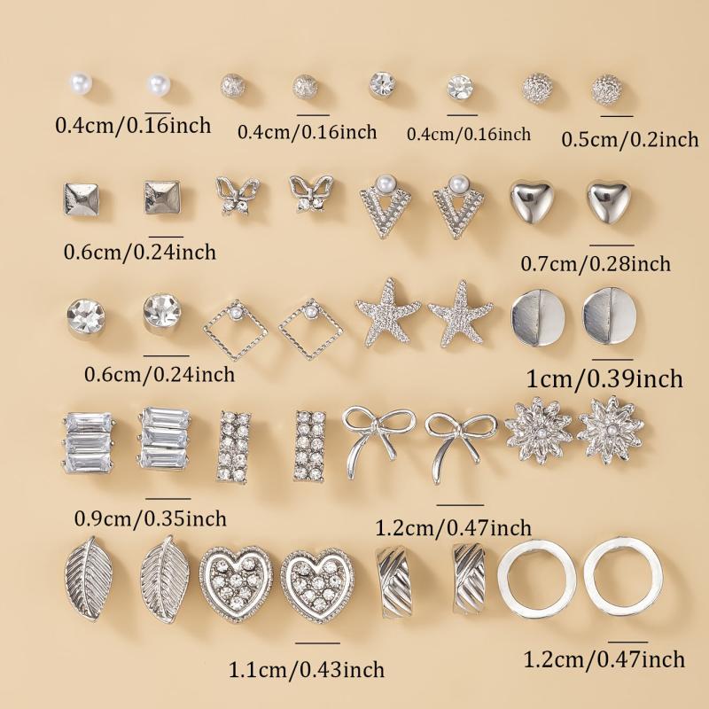 This set includes 20 pairs of metal earrings in assorted designs embellished with shimmering rhinestones. Perfect for daily wear and versatile styling.