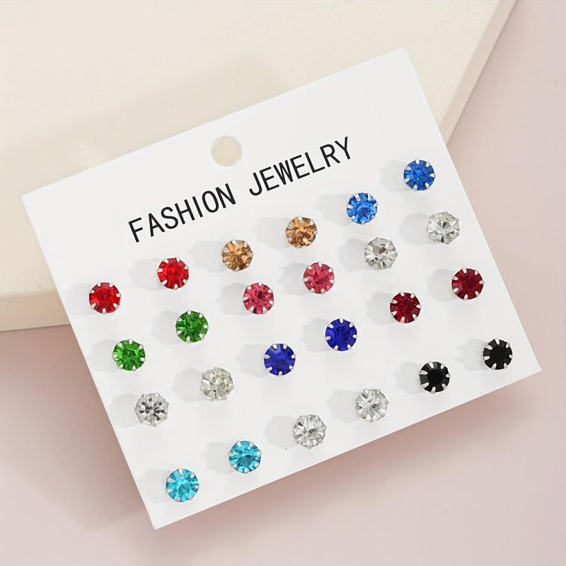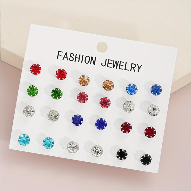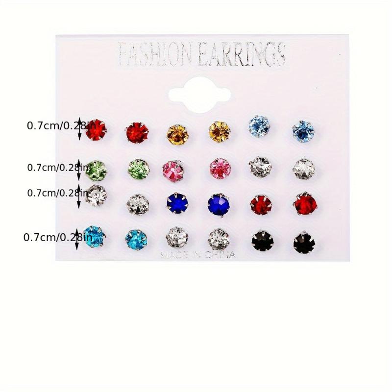 Get ready to shine with this set of 24 sparkling rhinestone stud earrings in various colors. Made with multicolor glass and durable stainless steel posts, these earrings are perfect for vacations, parties, and everyday wear.