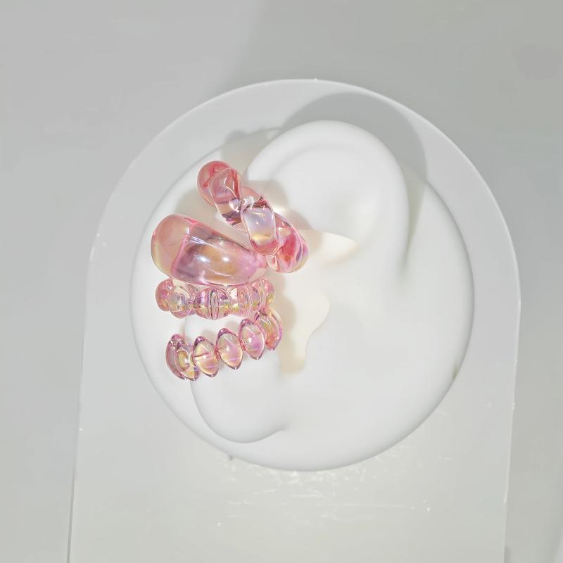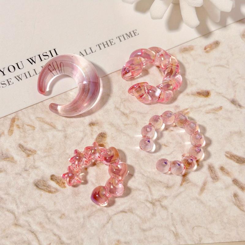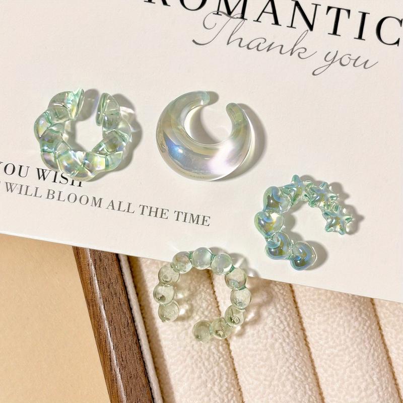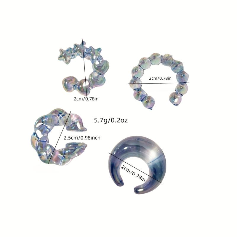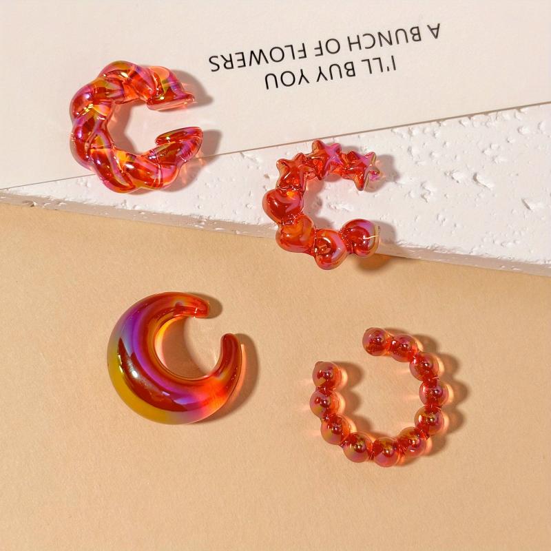 This set includes 4 pairs of clip-on earrings in rainbow moon, heart, star, and twisted C shape designs. Made of acrylic material that is lightweight and comfortable to wear.