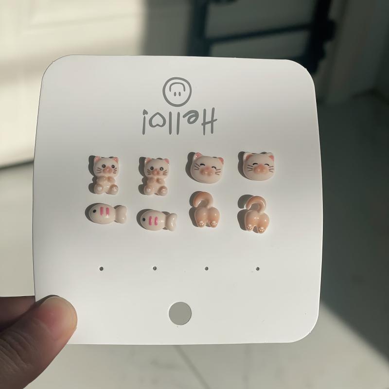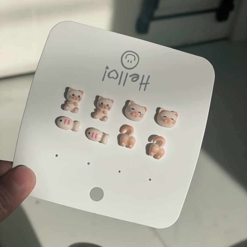 These cute cream colored cat ear stud earrings feature adorable kitten and fish designs, perfect for everyday wear. Lightweight and versatile, they are ideal accessories to complement any outfit.