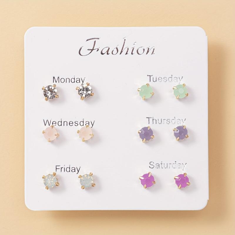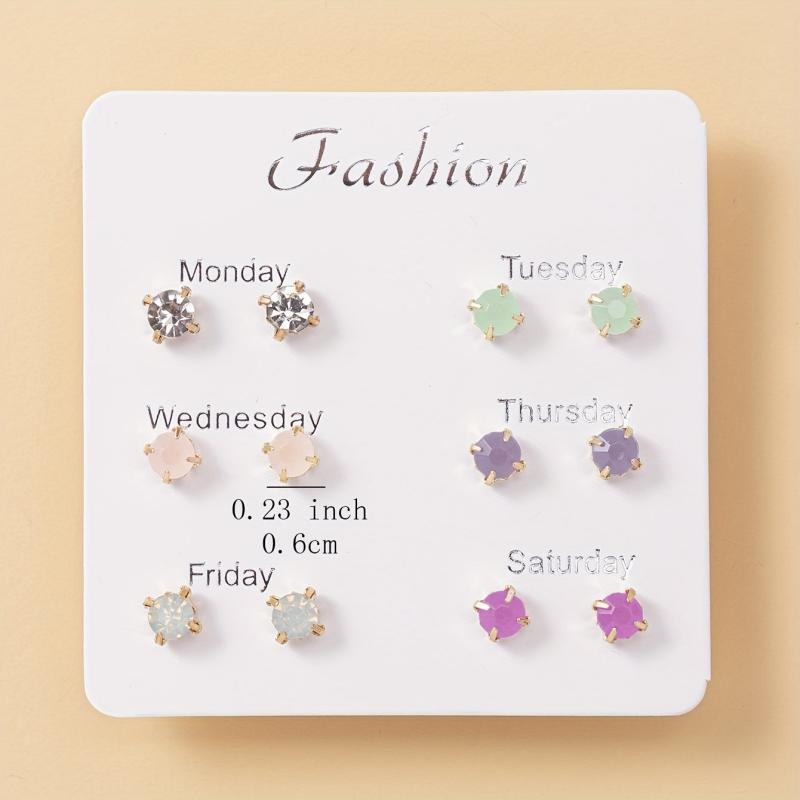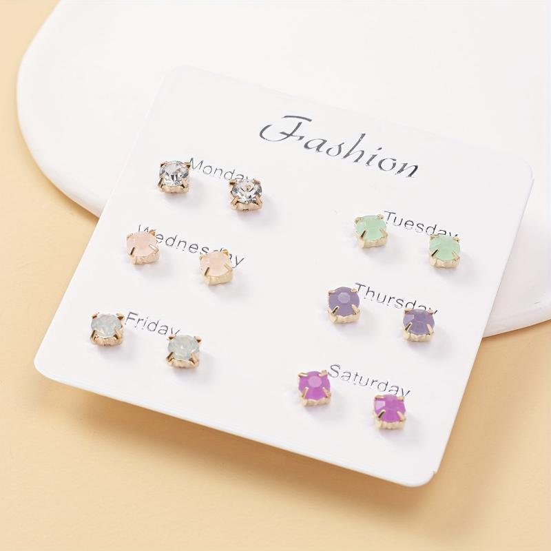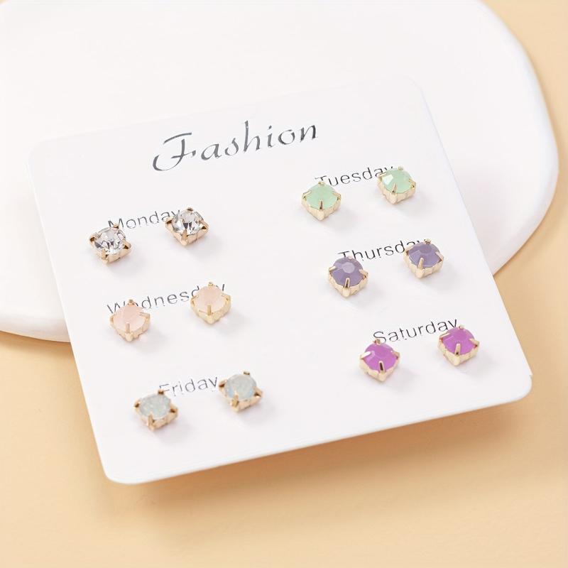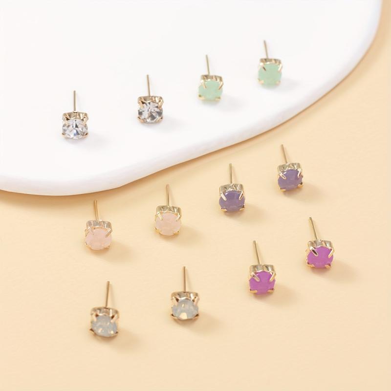 Add a pop of color and sparkle to your look with this set of 6 pairs of women's earrings featuring colorful crystals in a square claw setting.