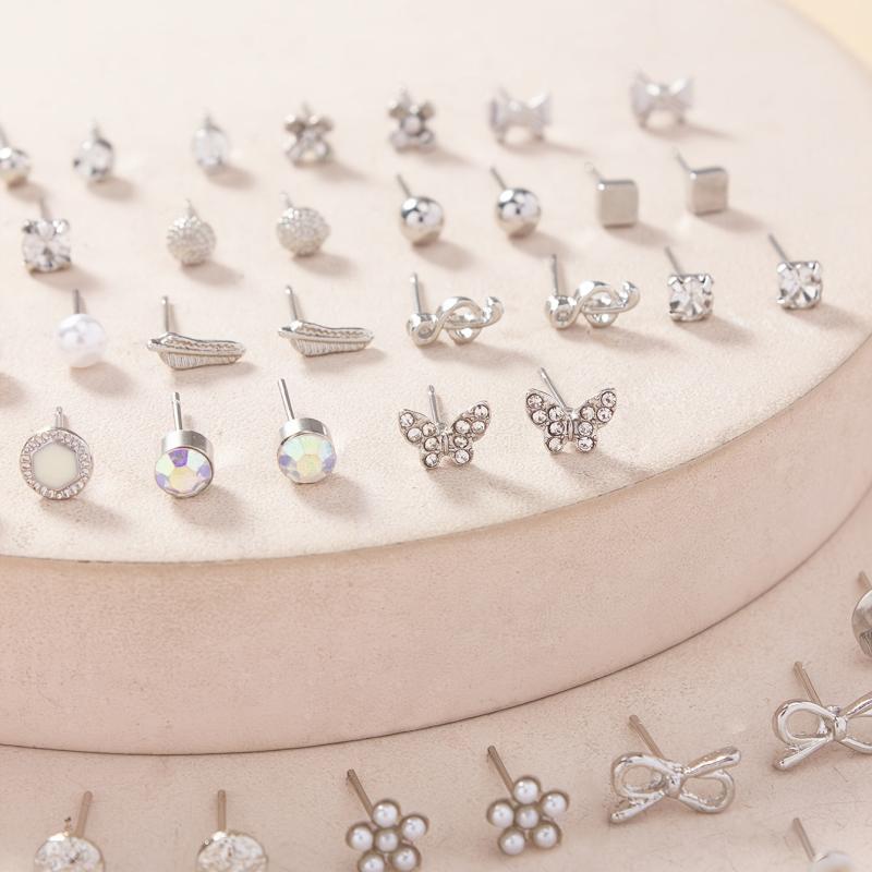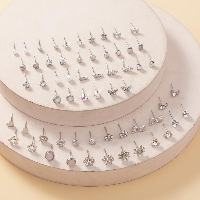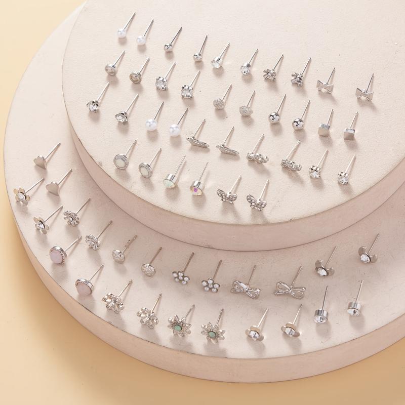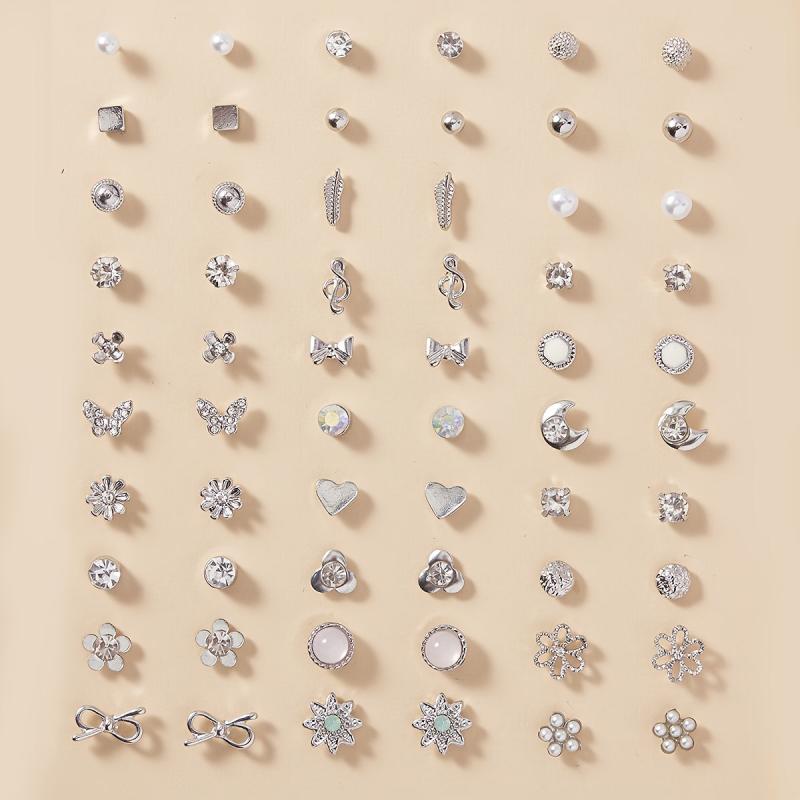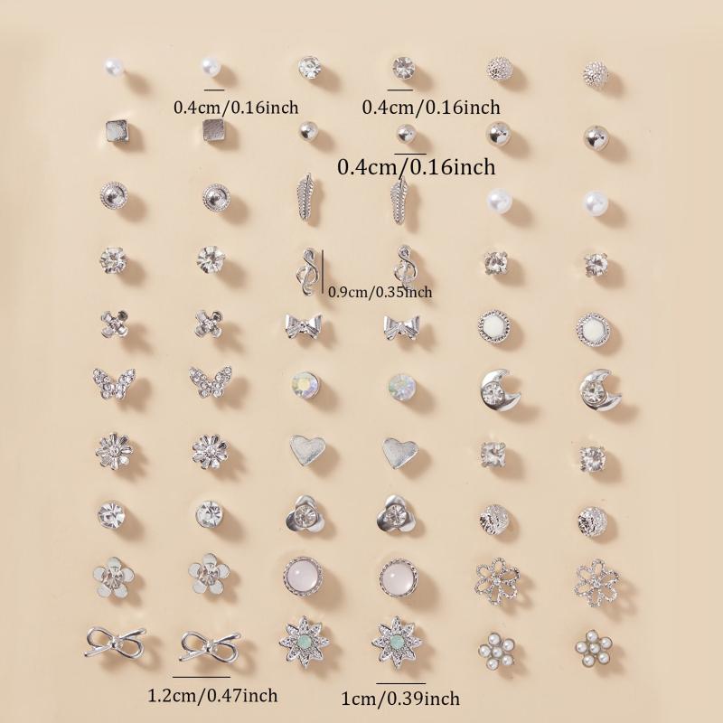 This earring set features 60 pieces of heart faux pearl and rhinestone flower designs, made of stainless steel with K golden plating. It is versatile jewelry suitable for daily wear and vacations.