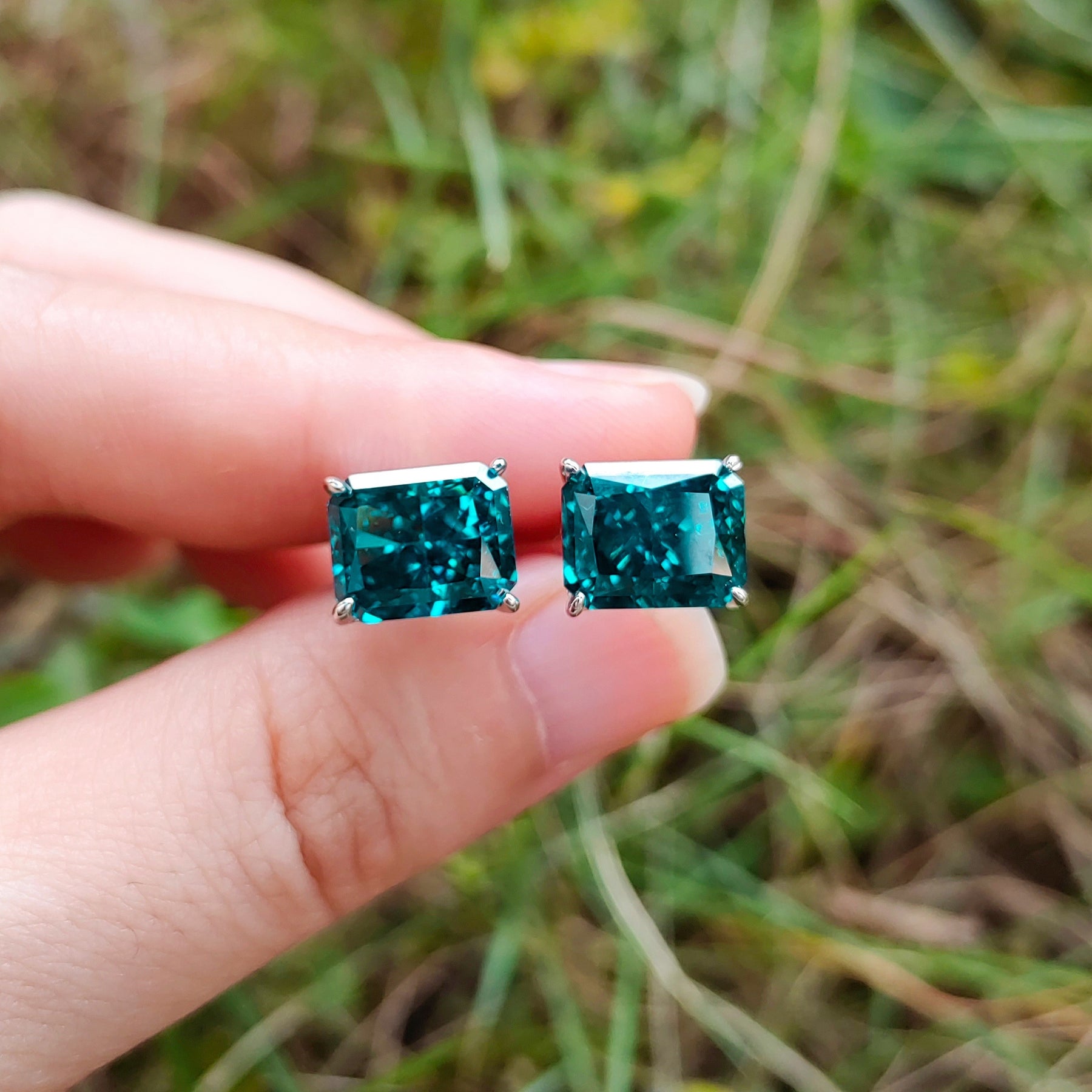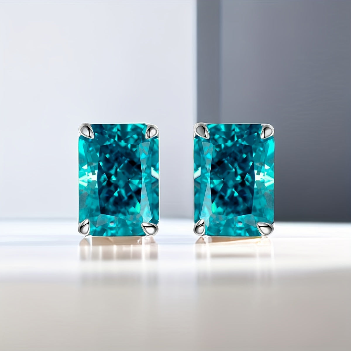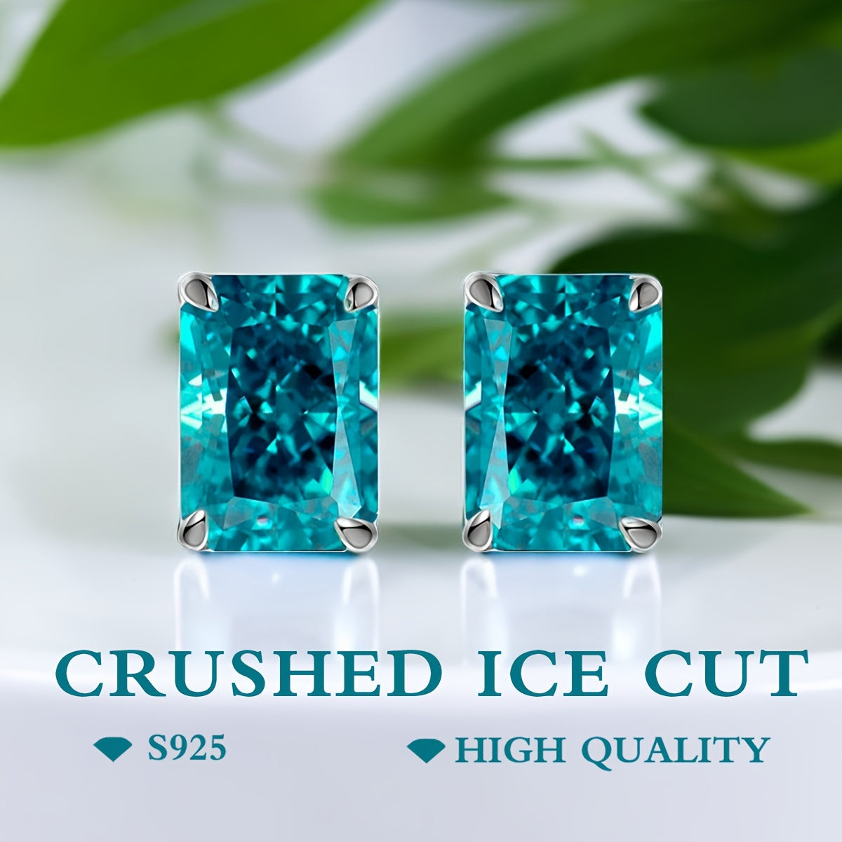 These stunning stud earrings feature 7 carat synthetic cubic zirconia with a bluish ink color. They are crafted in S925 sterling silver and golden fine metals, setting off the 5A good ice cut perfectly.