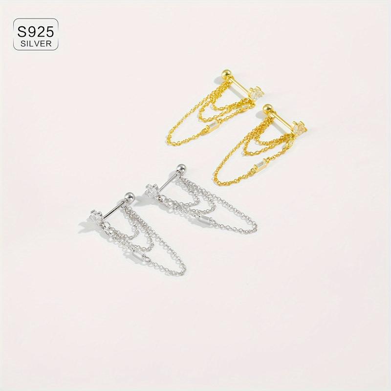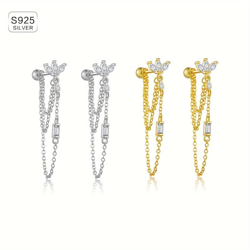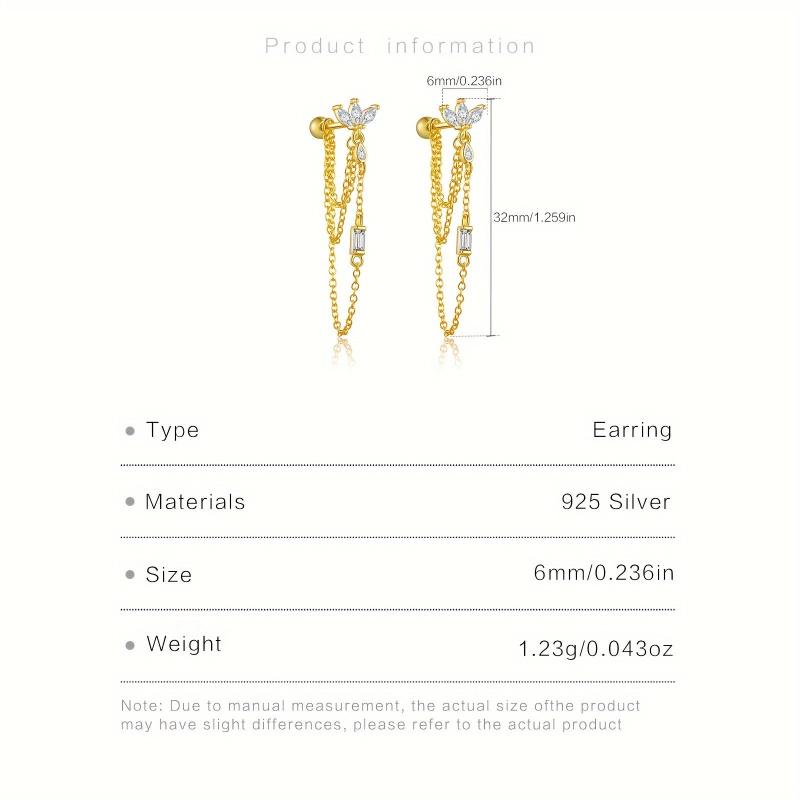 These stunning 925 sterling silver stud earrings feature sparkling cubic zirconia stones. Perfect for dates, parties, and everyday glamour. The earrings are lightweight at 1.23g and come with a chain for versatile wear. Ideal gift for women.
