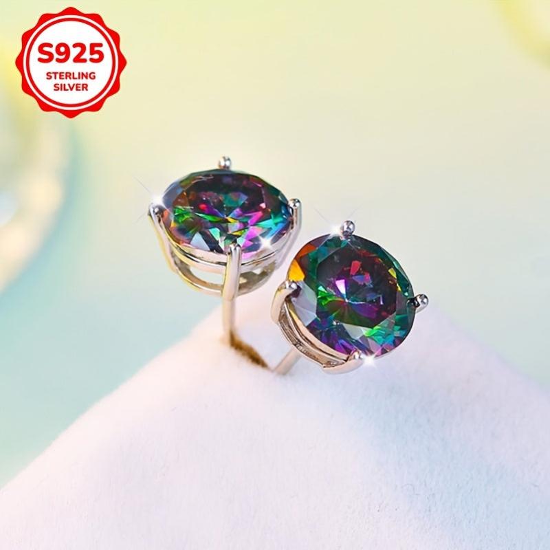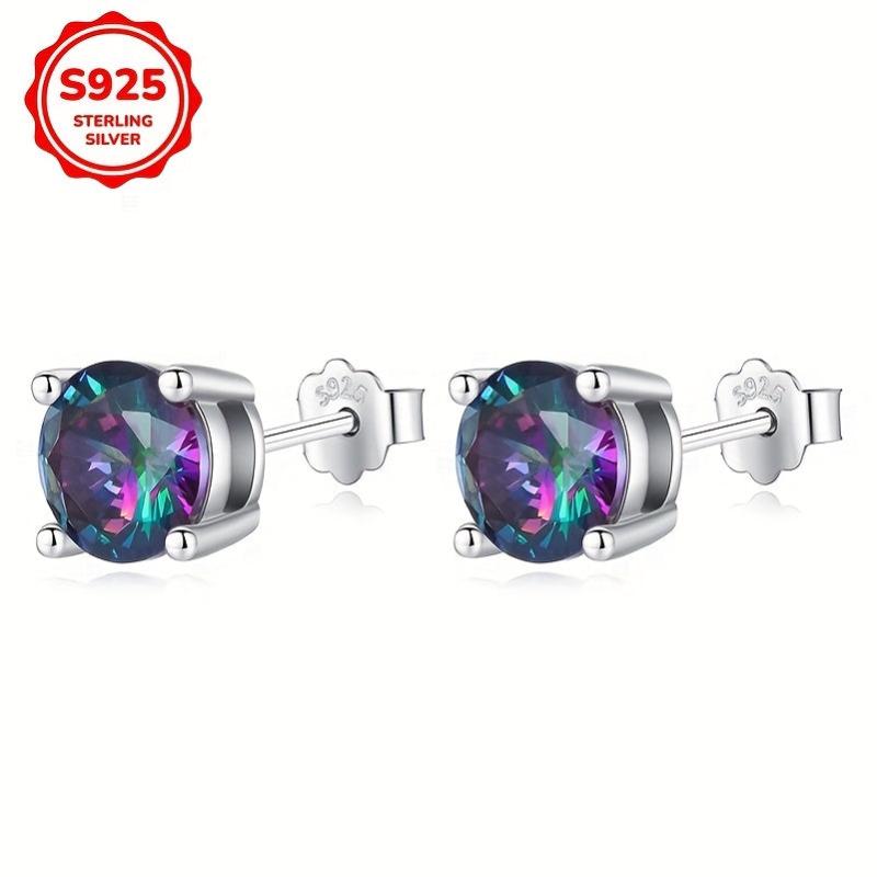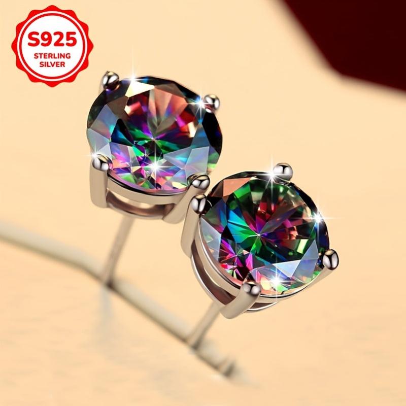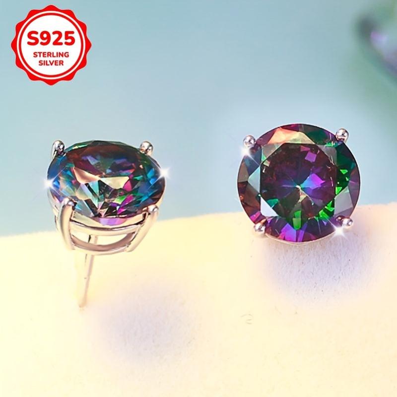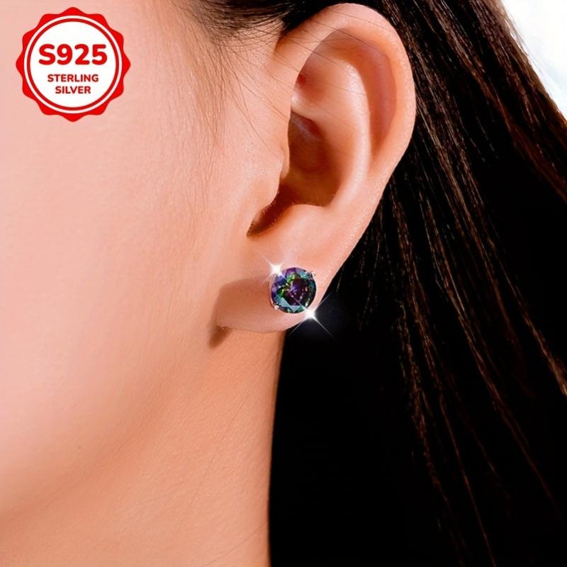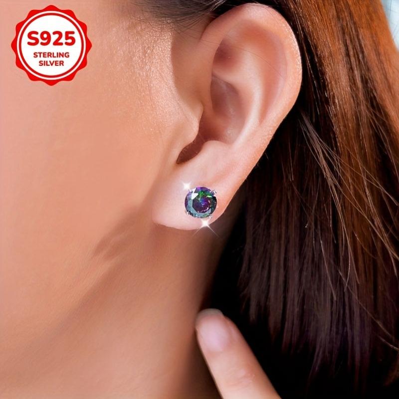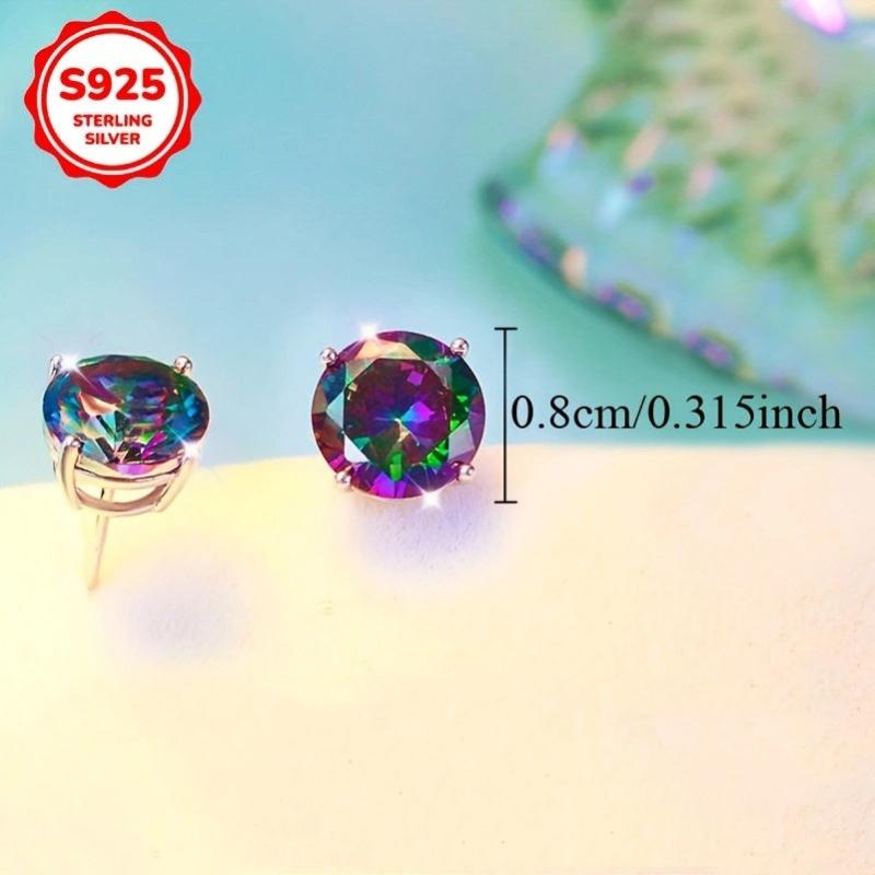 These stud earrings feature 8mm round rainbow zirconia stones set in 925 sterling silver. They are hypoallergenic and perfect for everyday wear.