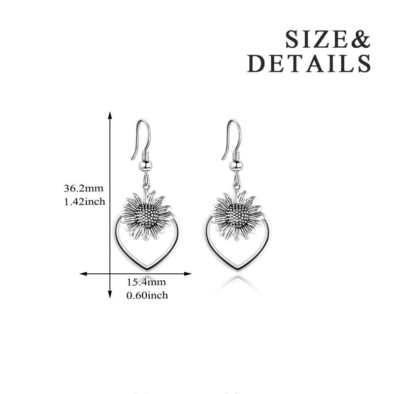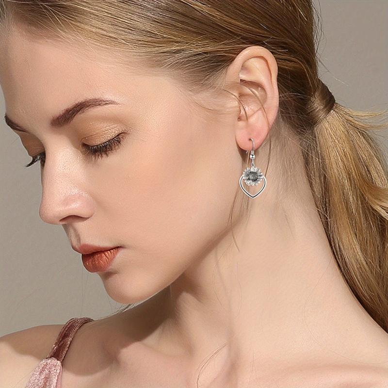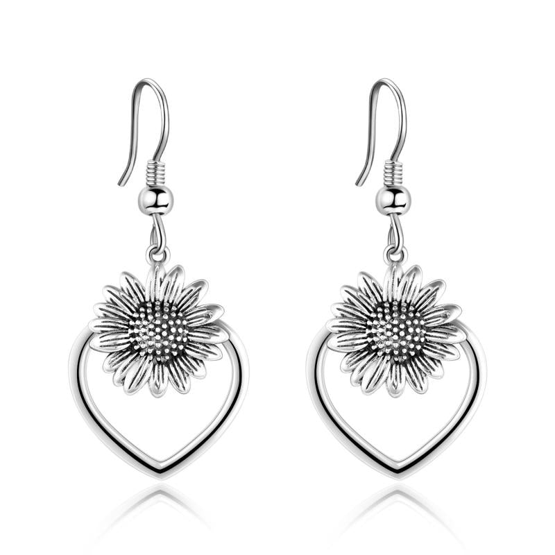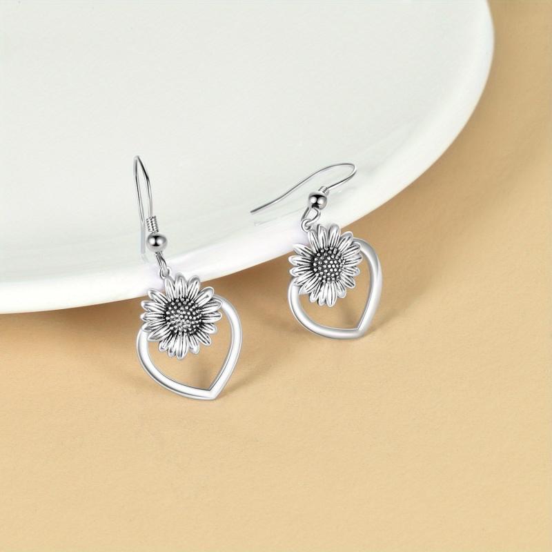 Beautiful and elegant 925 sterling silver heart sunflower dangle earrings with an oxidized finish for women.