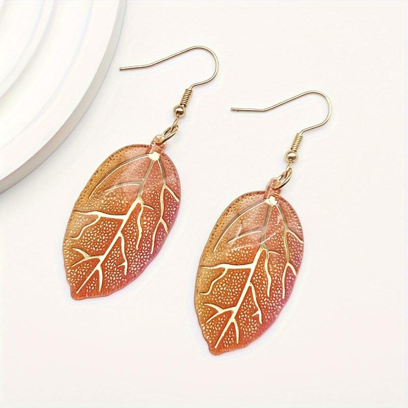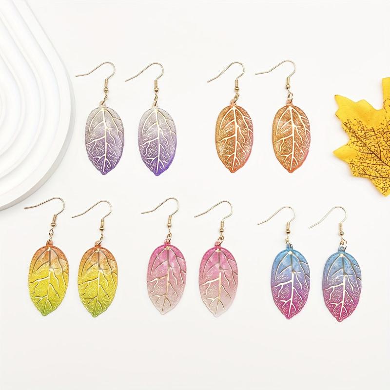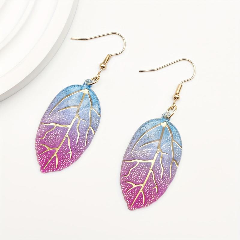 Add a touch of bohemian flair to your outfit with these vibrant acrylic leaf earrings. The gradient colors and golden accents make them a stylish and eye-catching accessory for any occasion.