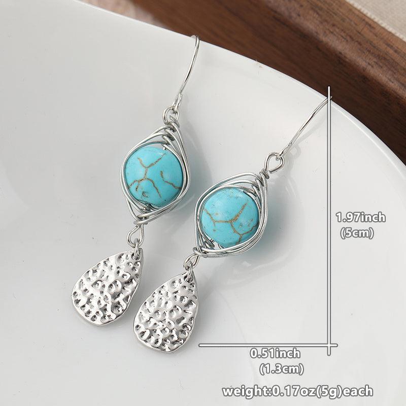 Handcrafted earrings featuring round synthetic turquoise and teardrop hammered pendants. Perfect for daily wear or vacation outfits.