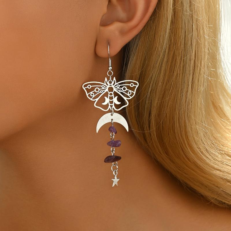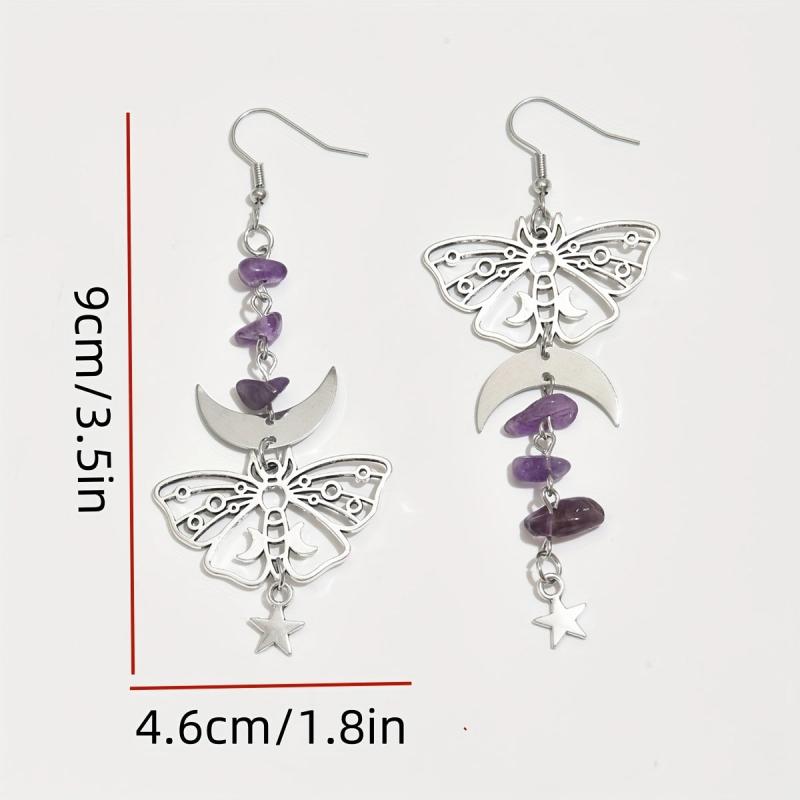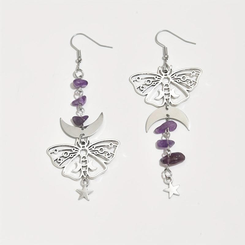 Add a touch of nature-inspired beauty with these boho butterfly and moth earrings featuring purple gemstones and star crescent moon dangle design.