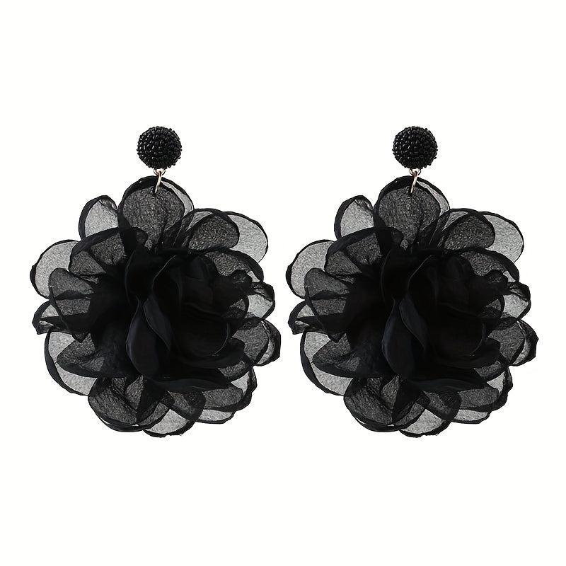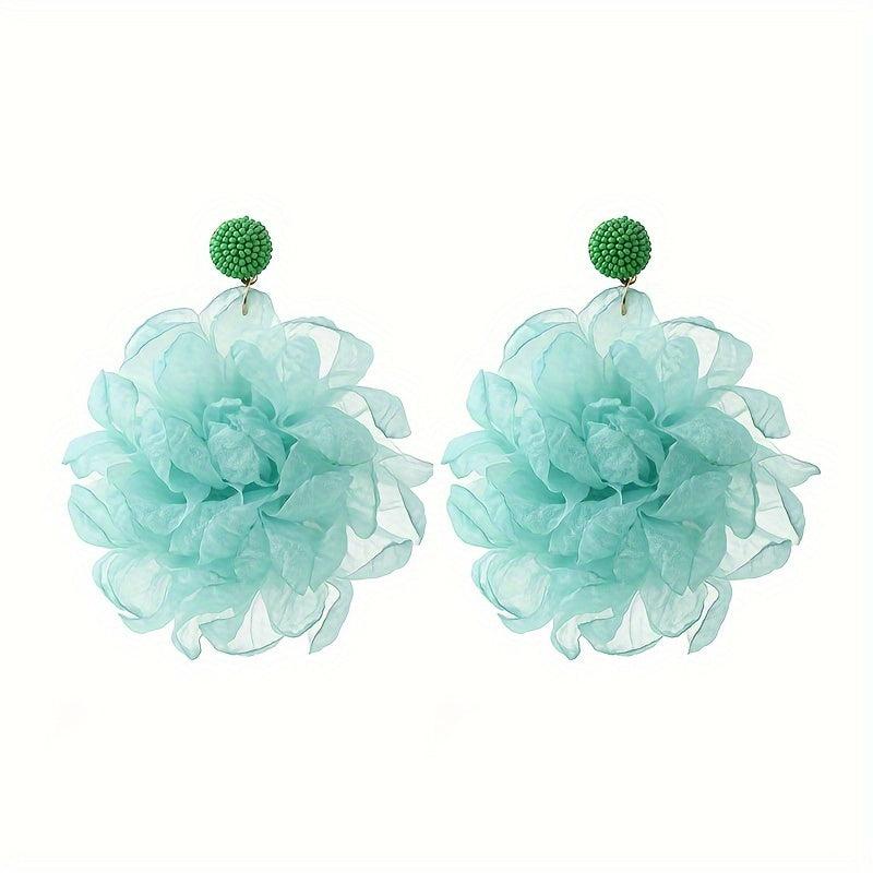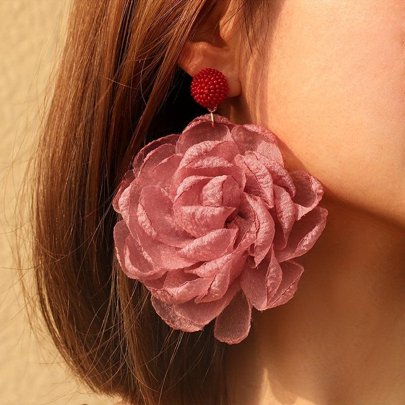 These boho fabric flower dangle earrings are perfect for vacation and casual attire. The stainless steel posts ensure durability, while the resin accents add a touch of elegance.