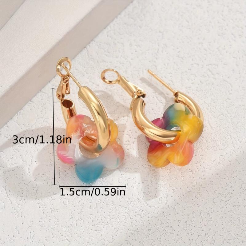 • Acrylic hoop earrings with multicolor pastel flowers and gold accents