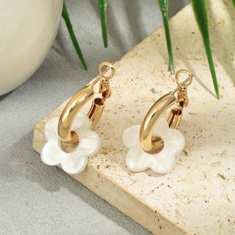 These lightweight acrylic hoop earrings feature a beautiful hollow out design with pastel flowers in various colors and golden tone accents. Ideal for adding a touch of bohemian style to your outfit for parties or events.