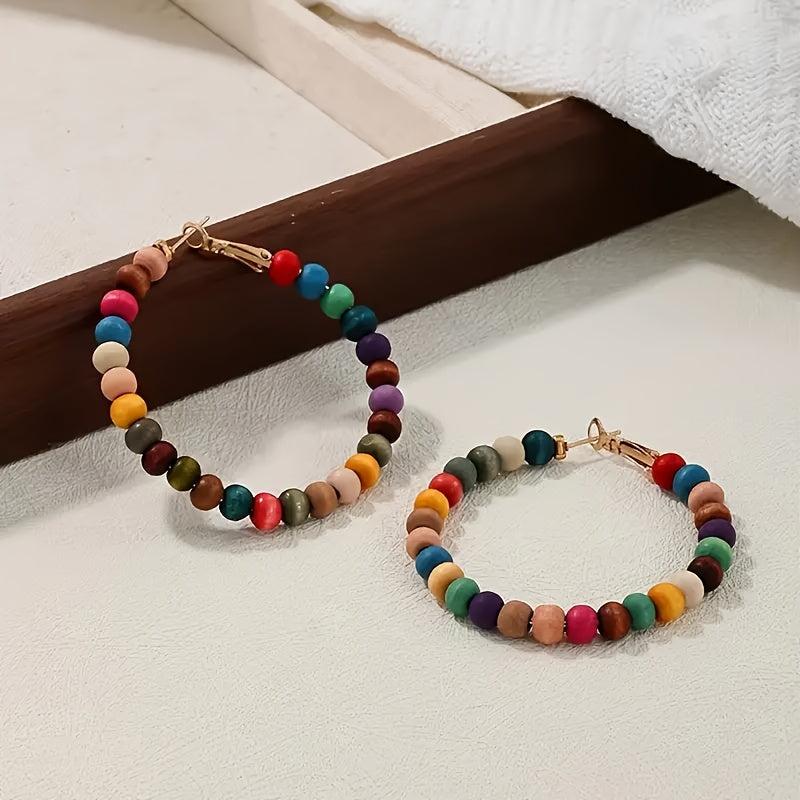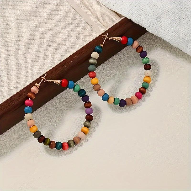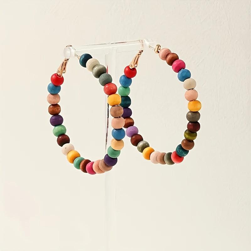 These boho wooden beaded earrings feature a colorful vintage style with iron hooks, making them perfect for daily wear, parties, and festivals. Add a touch of bohemian flair to your outfit with these unique earrings.