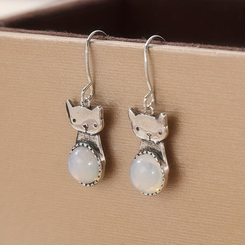 Adorable cat on the moon dangle earrings featuring rainbow moonstone. Silvery plated with copper material, great for daily wear or as a gift for mother.