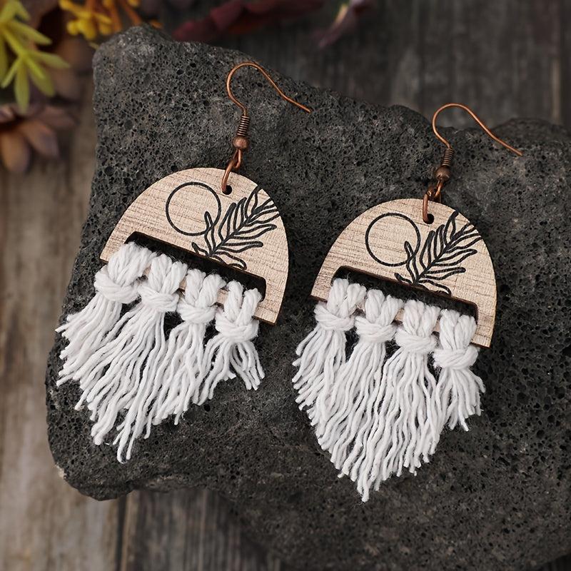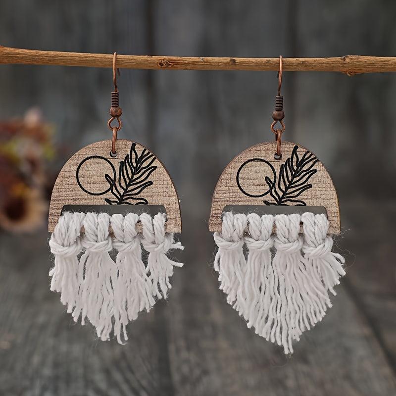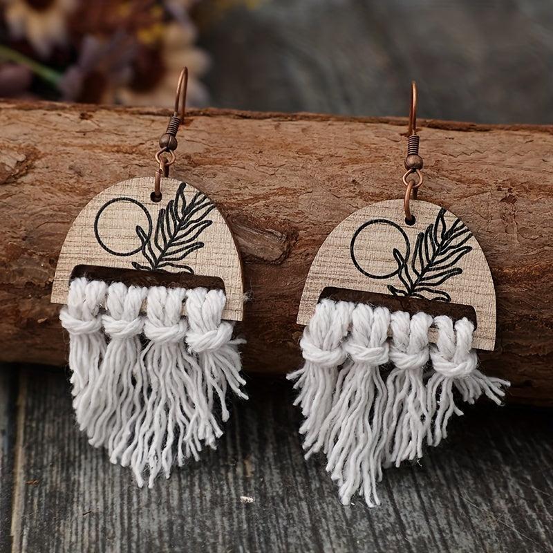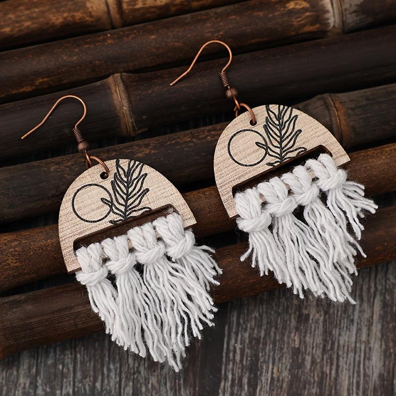 Elevate your holiday look with these bohemian retro style earrings featuring braided tassel ropes and wooden printed plant designs. Perfect for adding a touch of festive charm to your outfit.