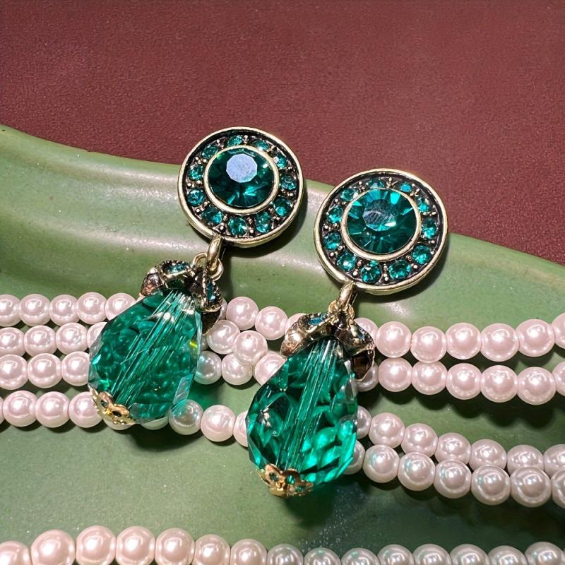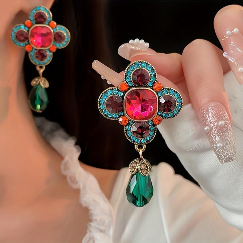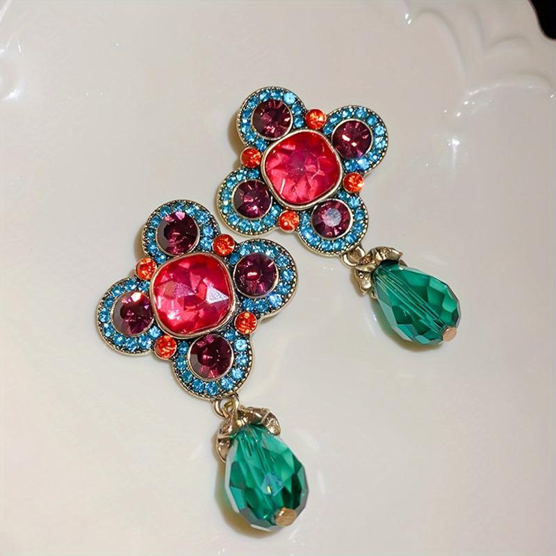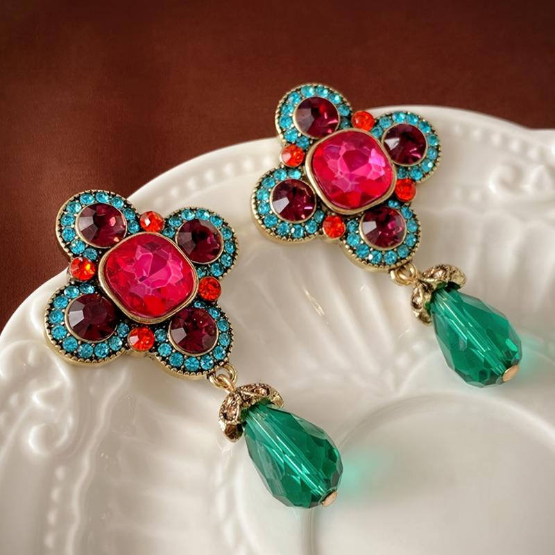 Add a pop of color to your outfit with these vintage-inspired earrings. Made of zinc alloy with rhinestone accents, these earrings are perfect for daily wear or gifting. Featuring red and green tea gemstones for a stylish look.