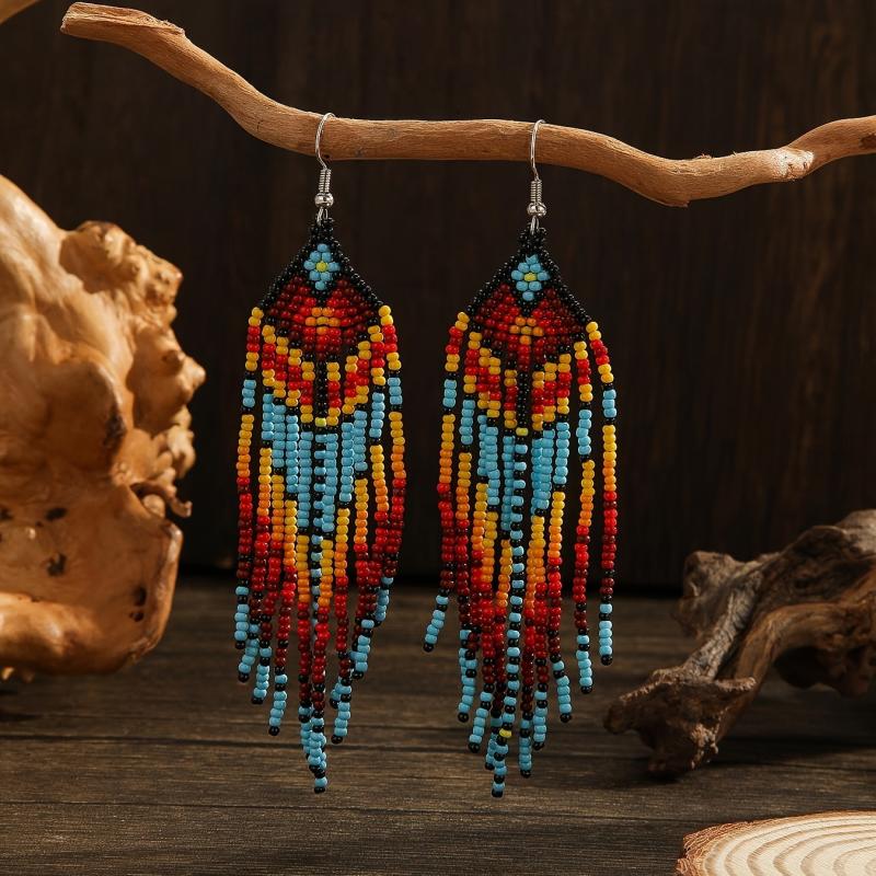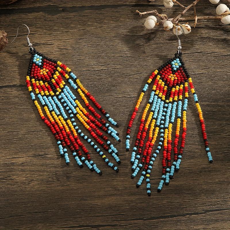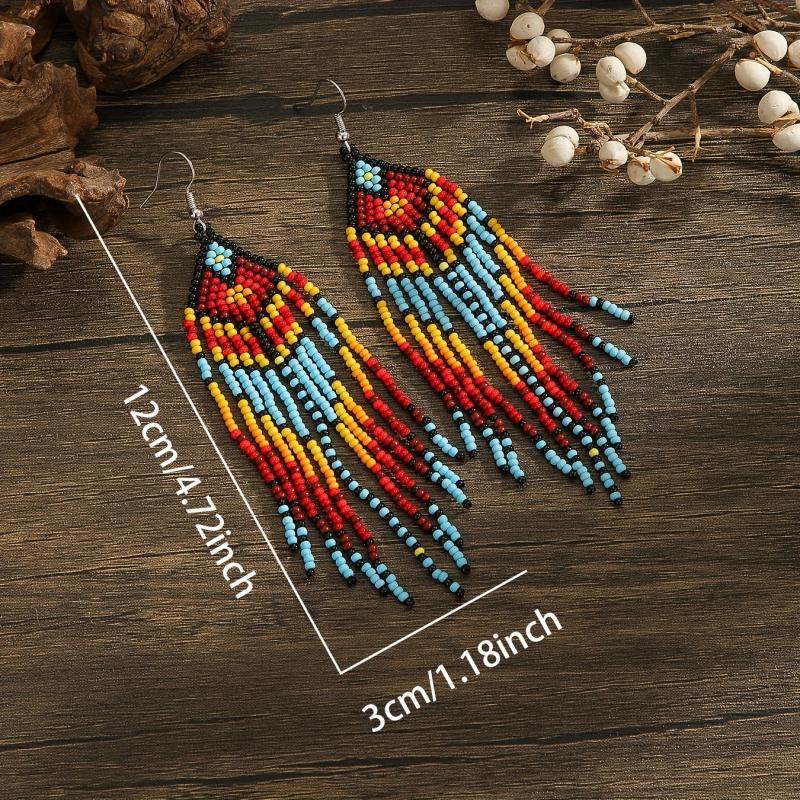 Enhance your bohemian look with these hand-woven ethnic style tassel earrings featuring vibrant glass beads.
