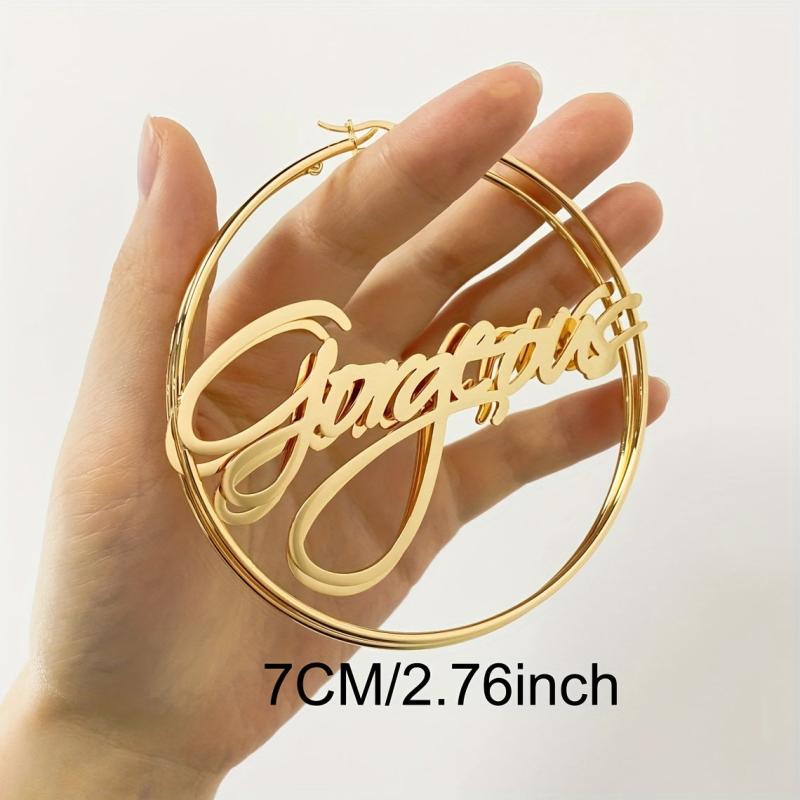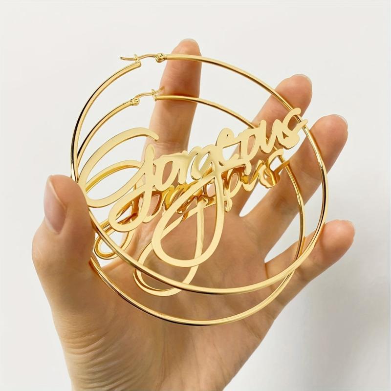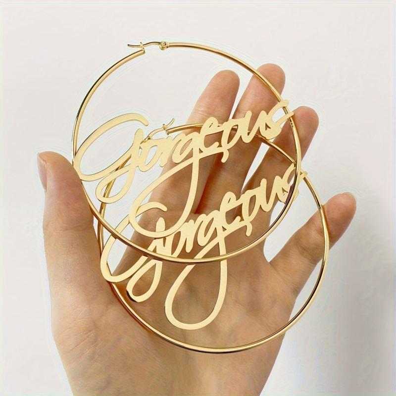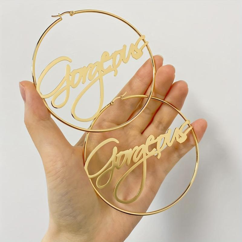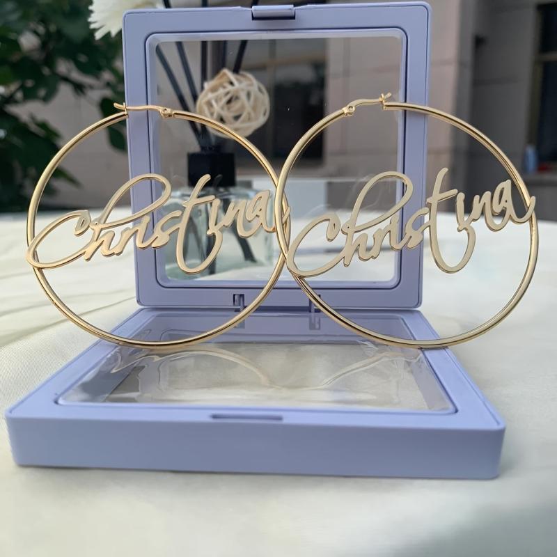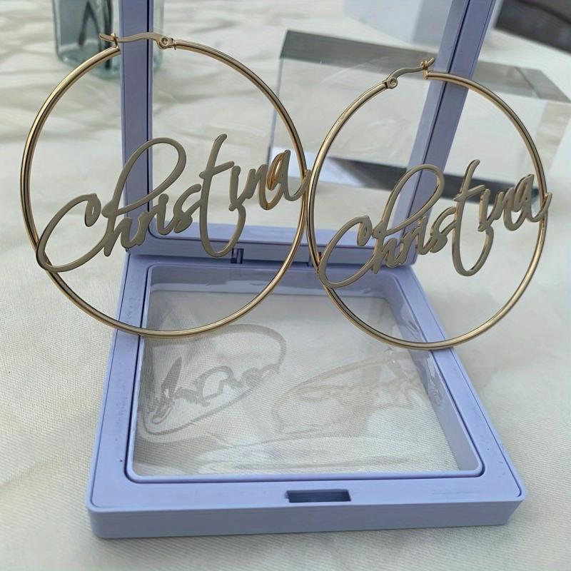 These 70mm name hoop earrings are a perfect addition to your jewelry collection. Made from stainless steel, these fashionable earrings can be personalized with your name. They are suitable for daily wear and make a stylish statement.