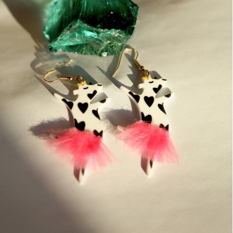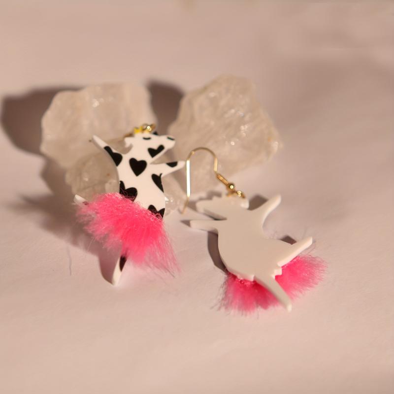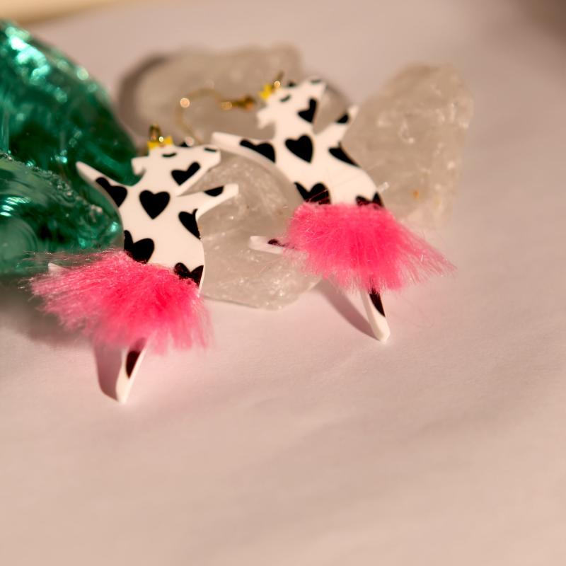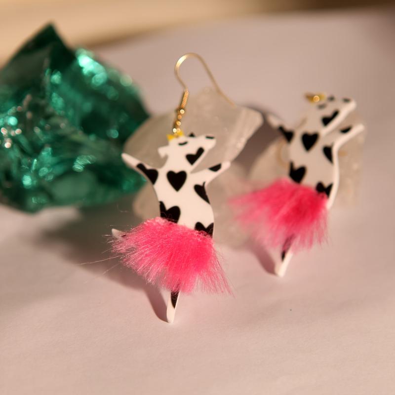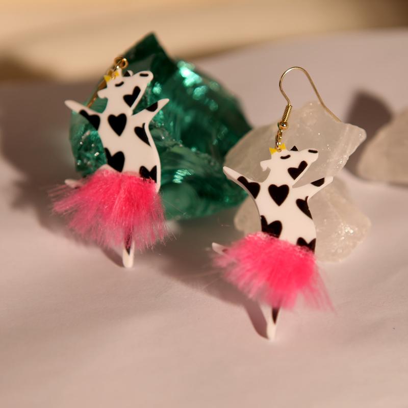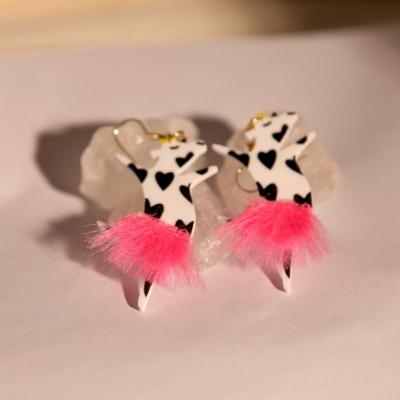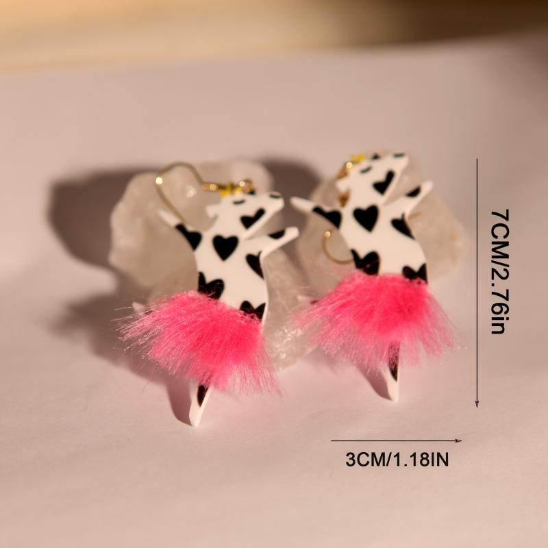 Quirky and fun, these acrylic dangle earrings feature whimsical dancing cows in tutus with pink fluffy tails and heart cutouts. Perfect for women and teens who love unique animal-inspired jewelry.