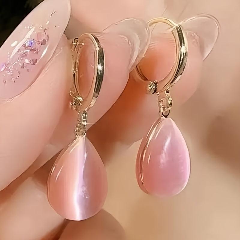 These double-sided cat eye stone earrings feature a golden tone metal teardrop design with smooth and textured pink gemstones. They are perfect for adding a touch of elegance to any outfit.