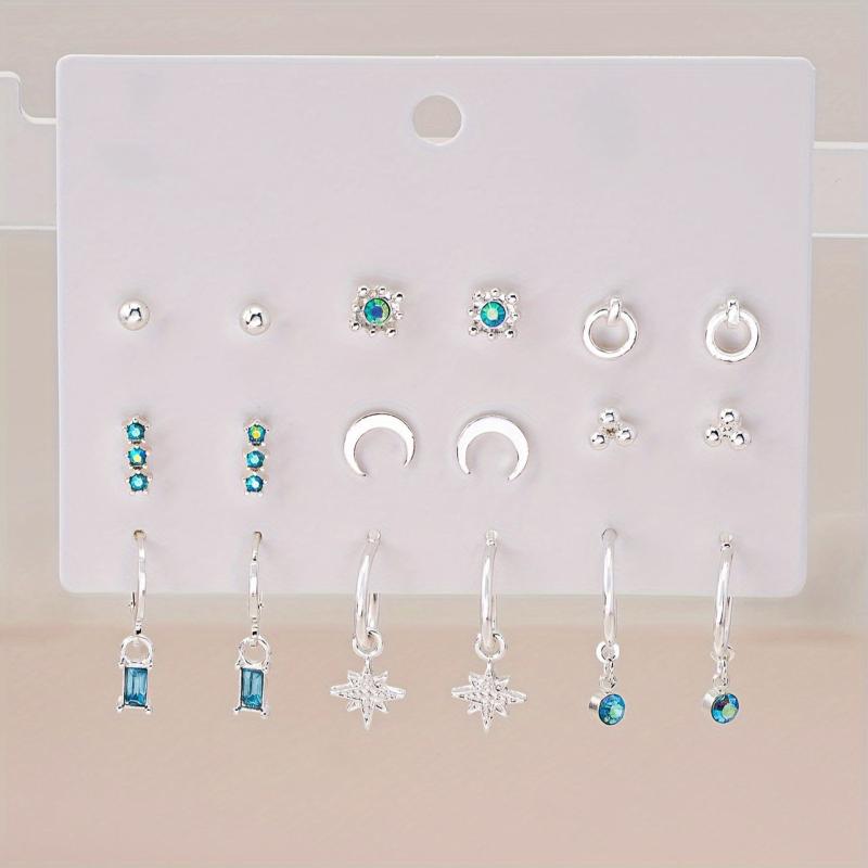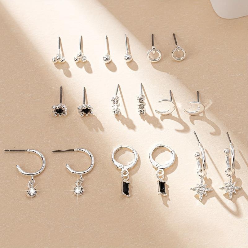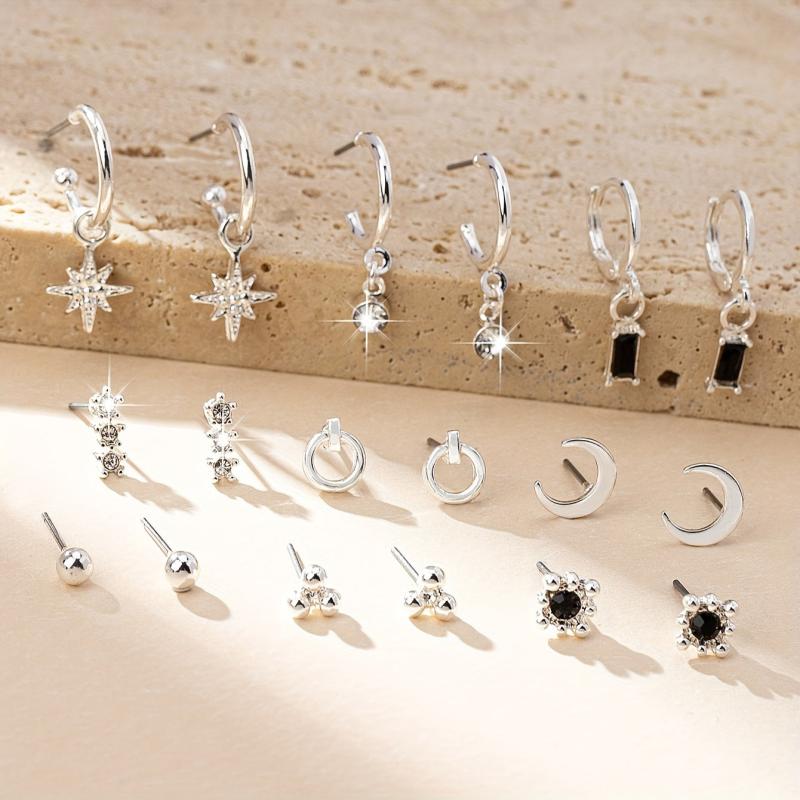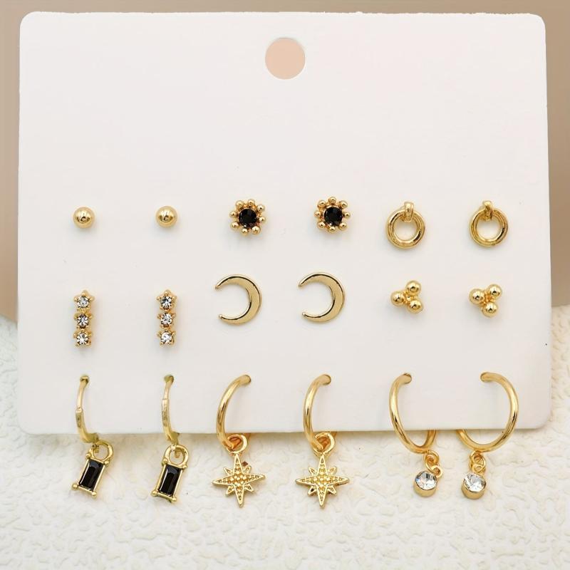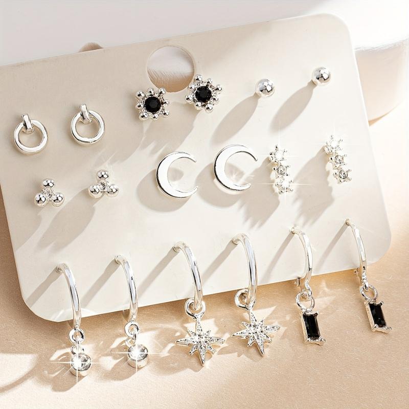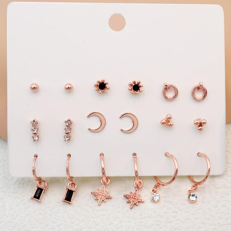 Upgrade your daily wear with this set of 9 pairs of silver plated and golden earrings, featuring rose, bean, moon, and star designs. Perfect for women who want to add a touch of glamour to their outfits.