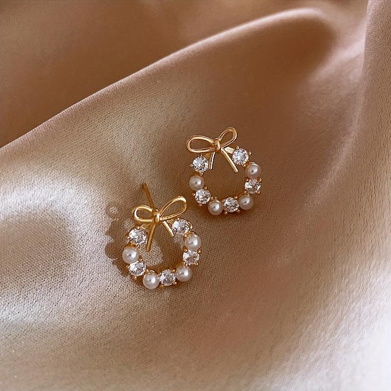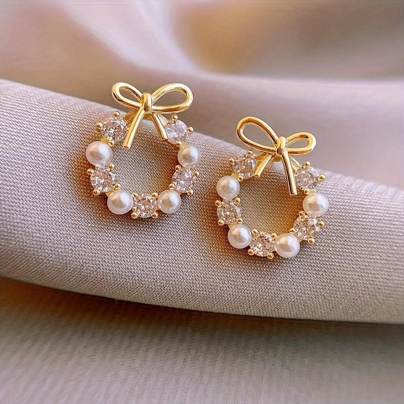 Elegant and stylish faux pearl bowknot stud earrings featuring rhinestone accents, suitable for daily wear.