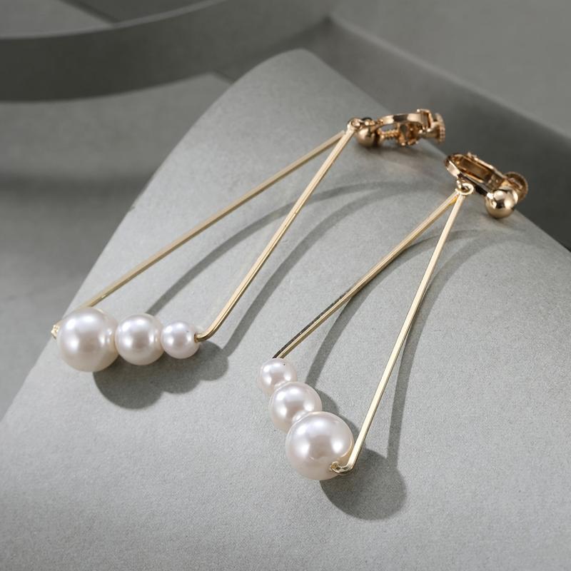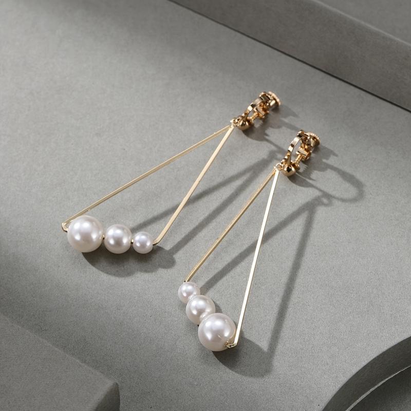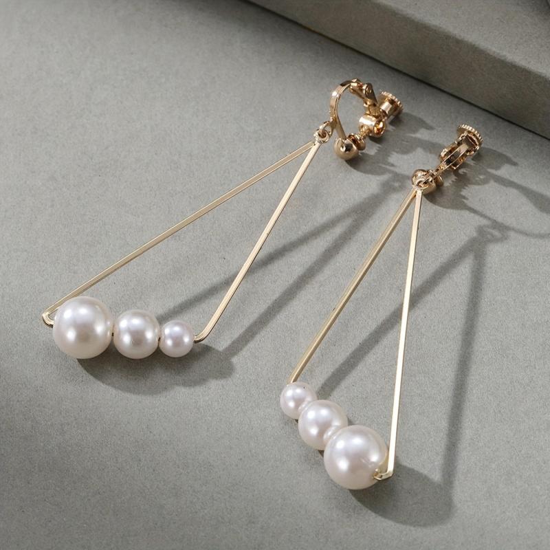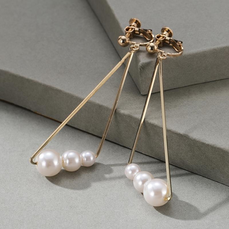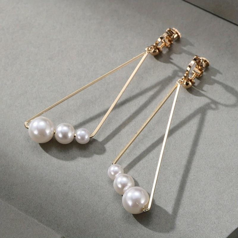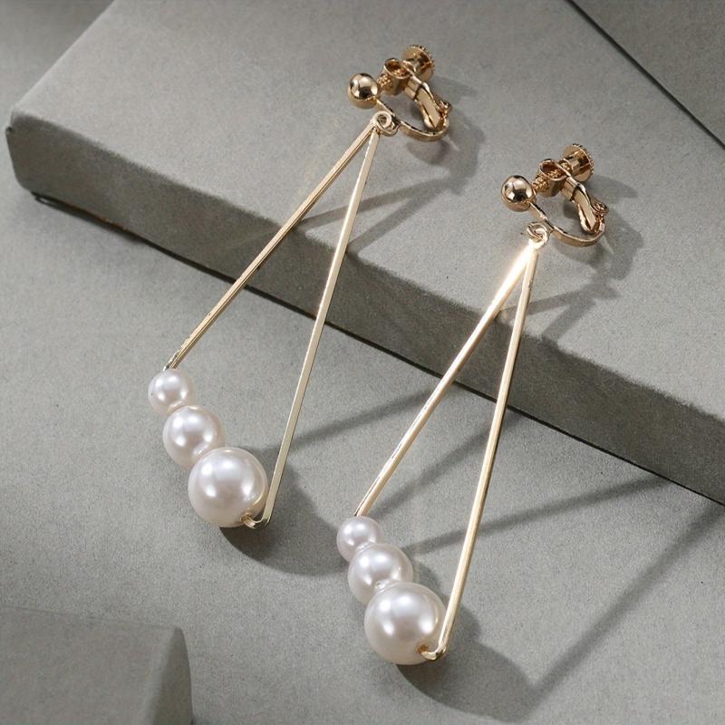 Add a touch of sophistication to your look with these triangle-shaped faux pearl clip-on earrings. Ideal for parties, weddings, and everyday wear.