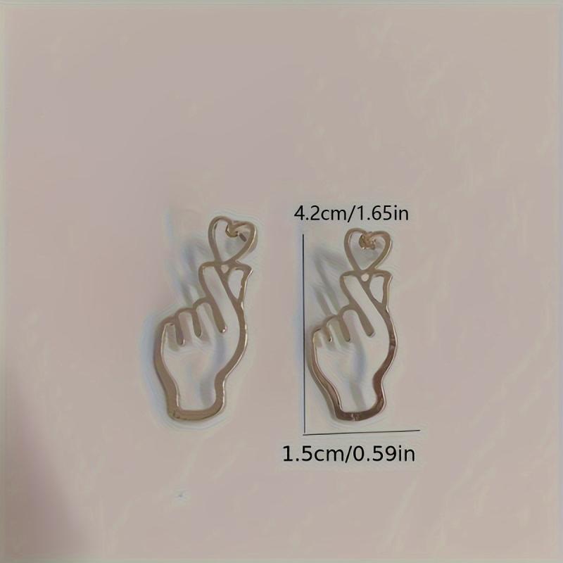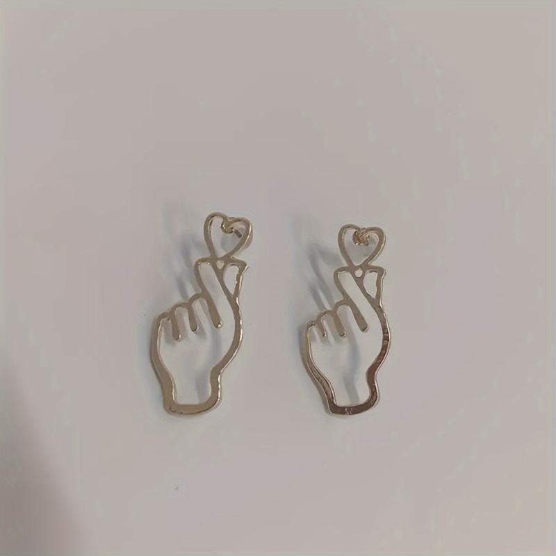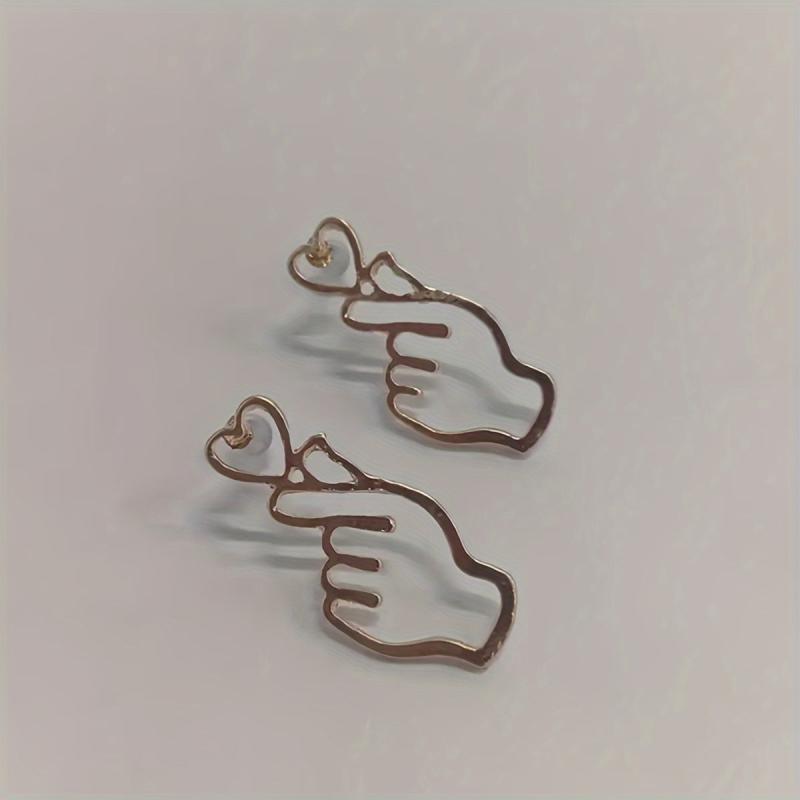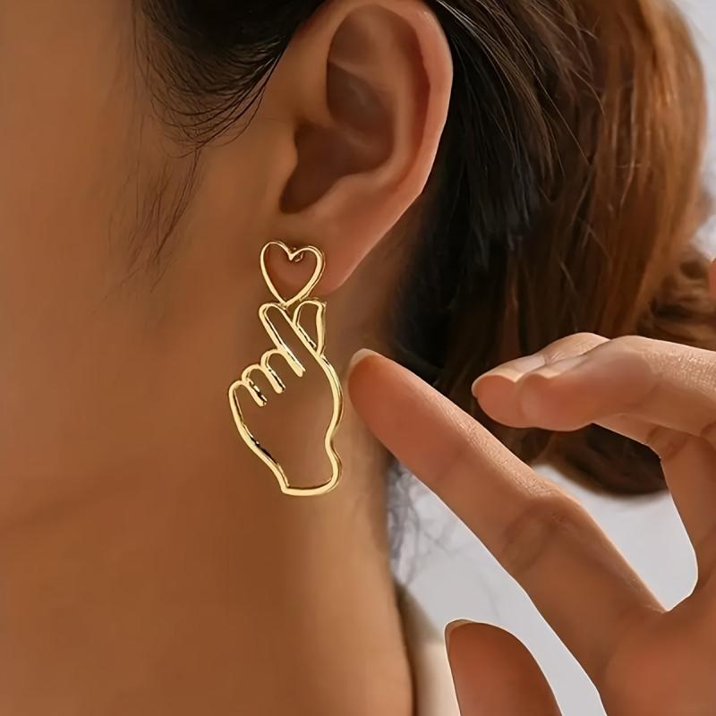 Minimalist finger heart gesture earrings made of lightweight golden tone alloy. Perfect for everyday wear or as a gift idea for women and girls.
