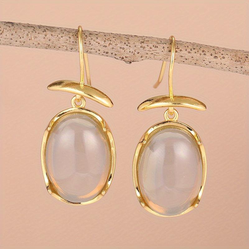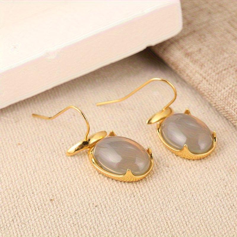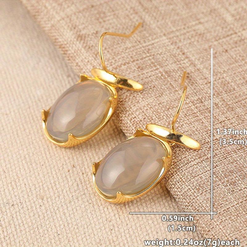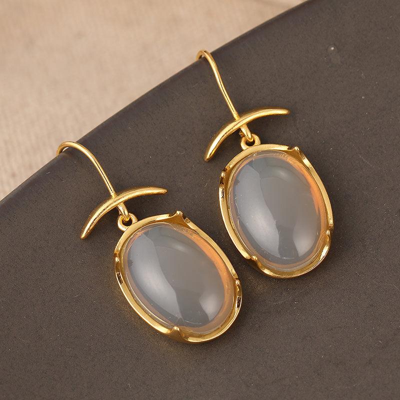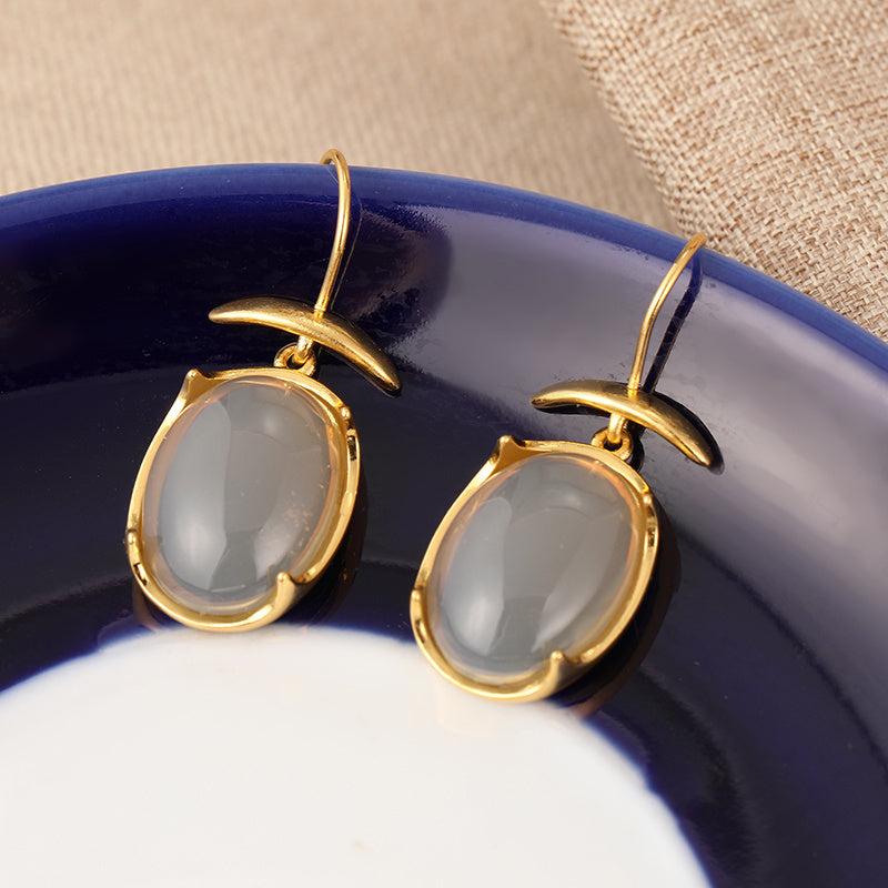 Elegant golden plated earrings featuring inlaid grey cat's eye pendant, perfect for daily wear and as a thoughtful mother's gift. Quirky and stylish design.