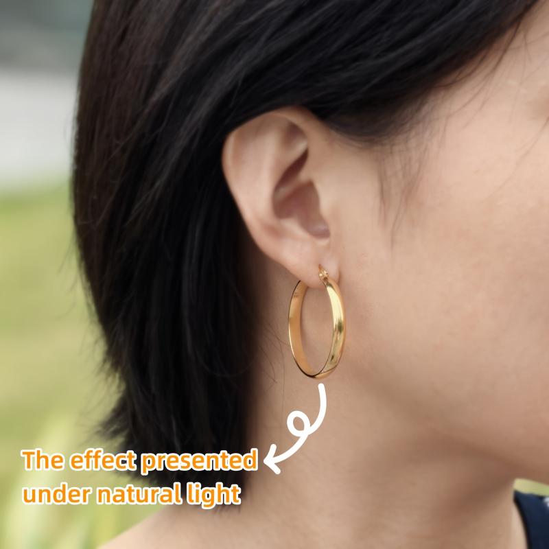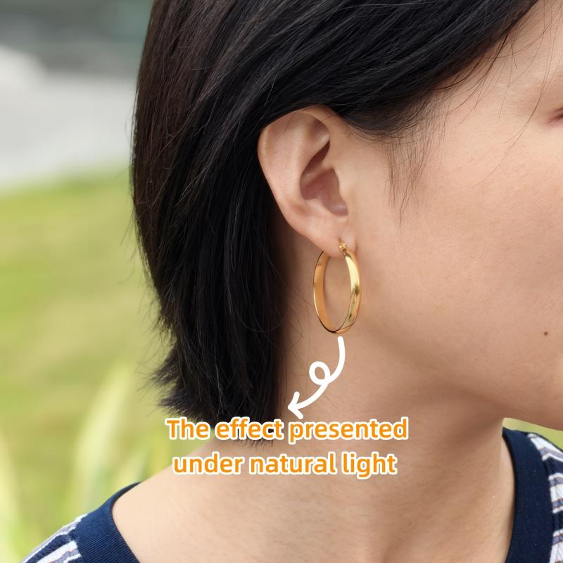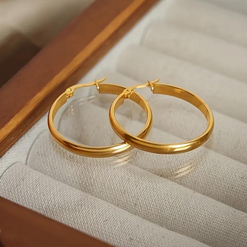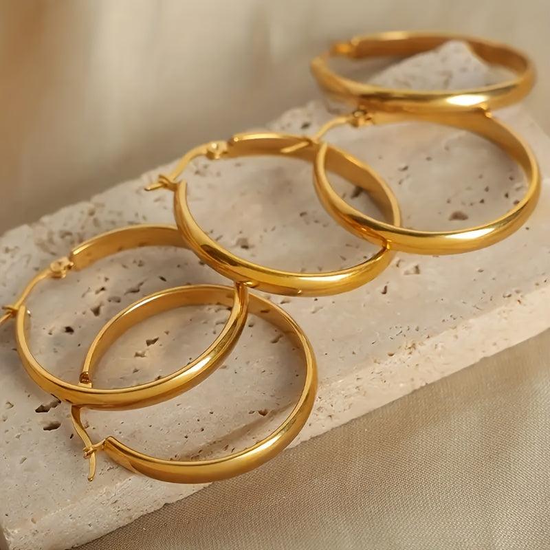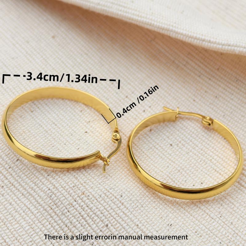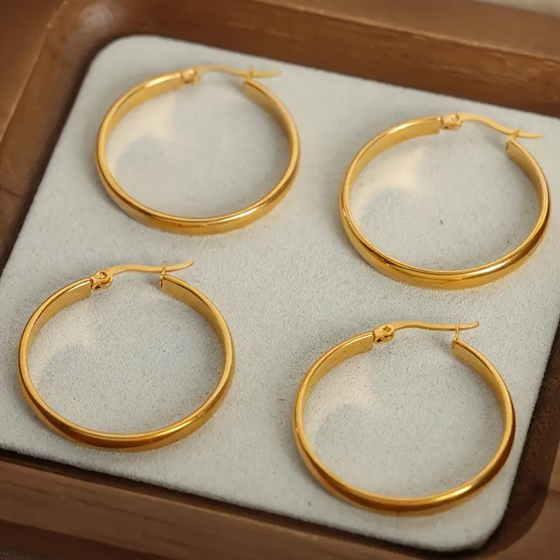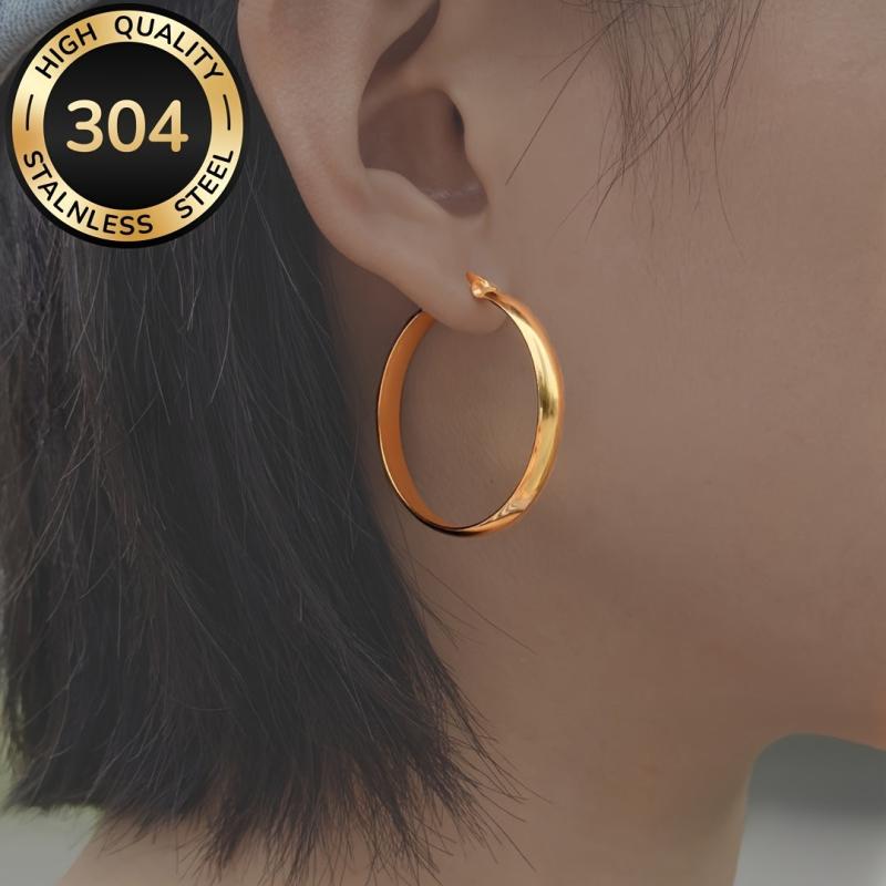 Add a touch of glamour to your outfit with these golden stainless steel hoop earrings. Perfect for parties or special occasions, these earrings are hypoallergenic and comfortable to wear.