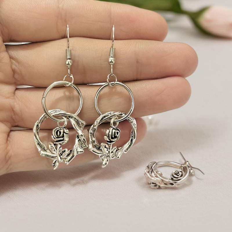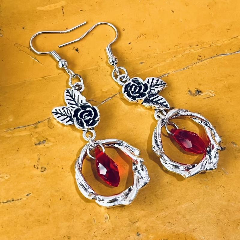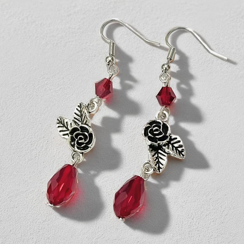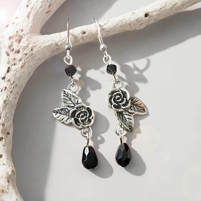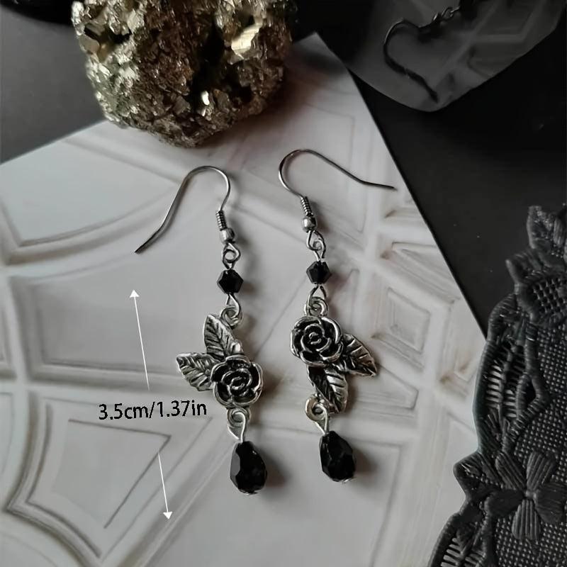These romantic dark earrings are perfect for a witchy goddess. They feature a gothic design with roses and crystals, ideal for women who love vintage jewelry.