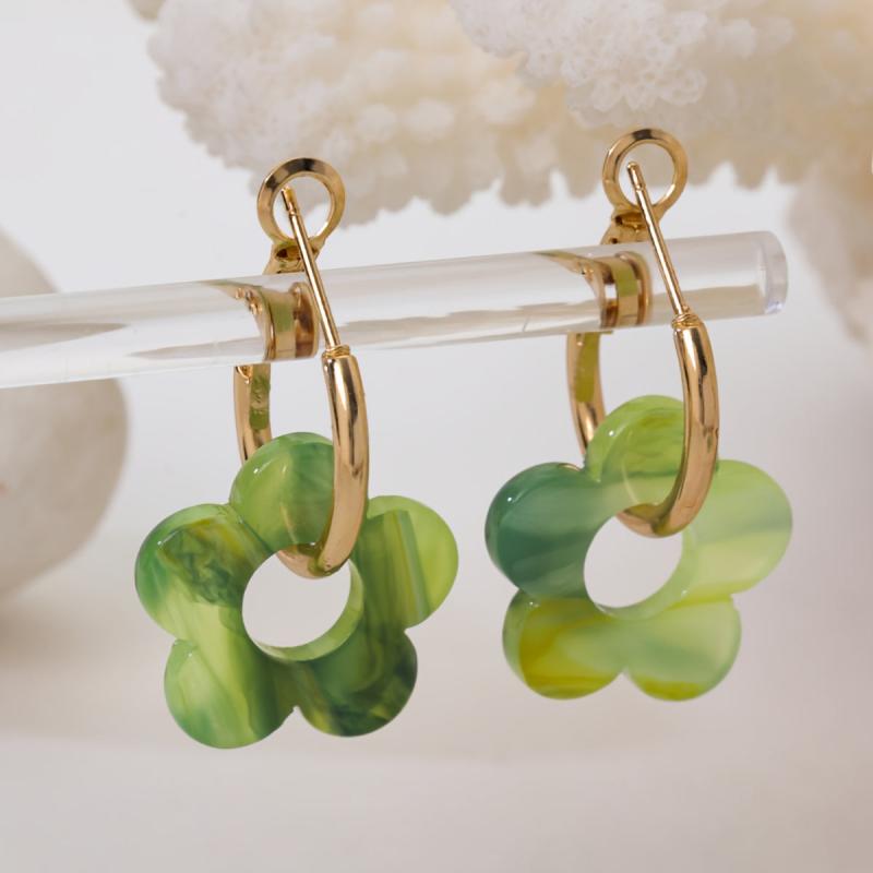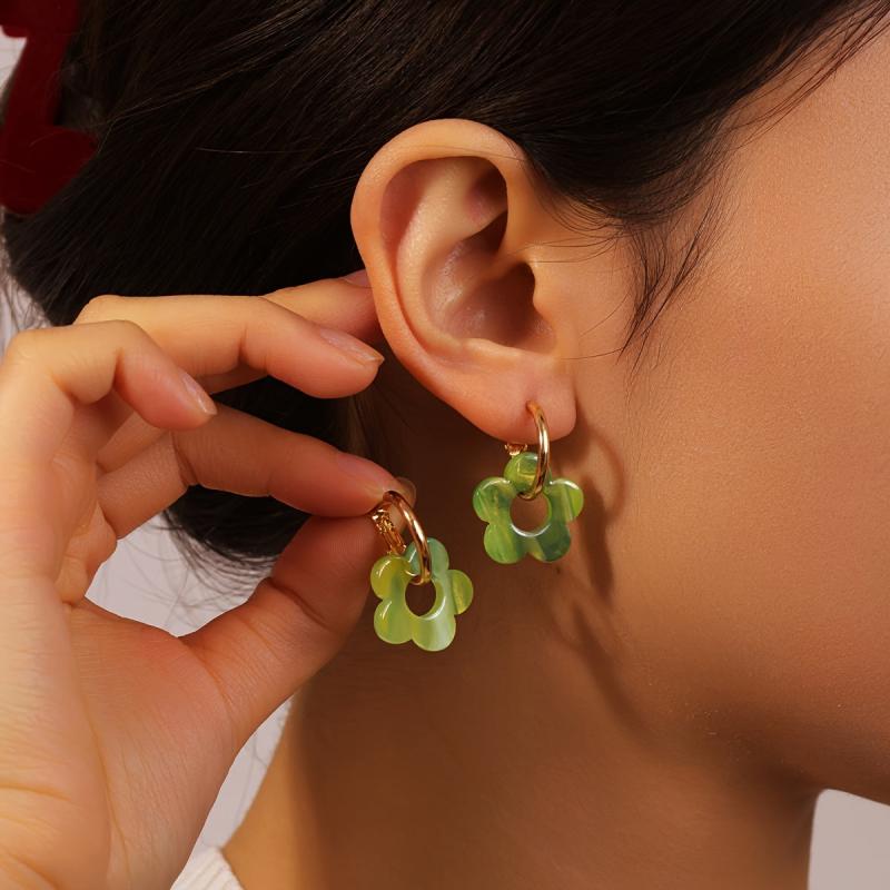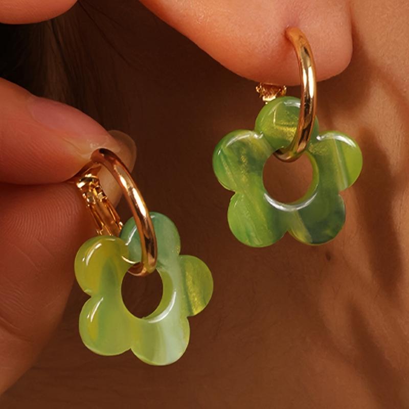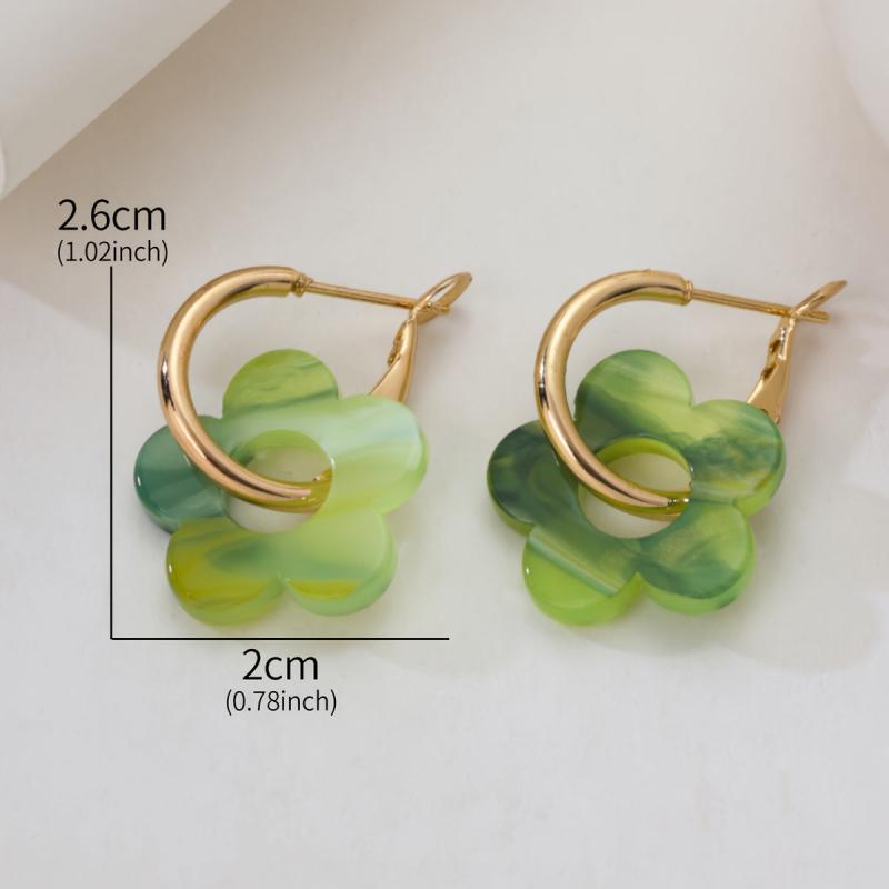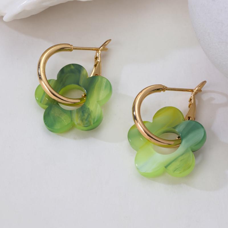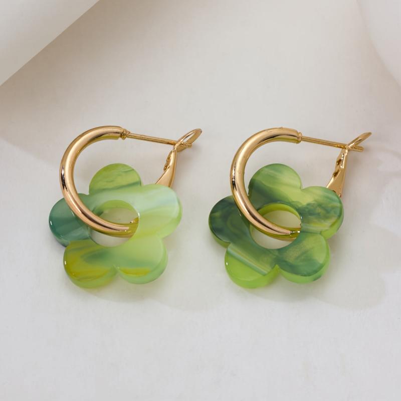 These stylish earrings feature green and yellow acrylic flowers on golden tone hoops. They are lightweight, vibrant, and perfect for casual attire.