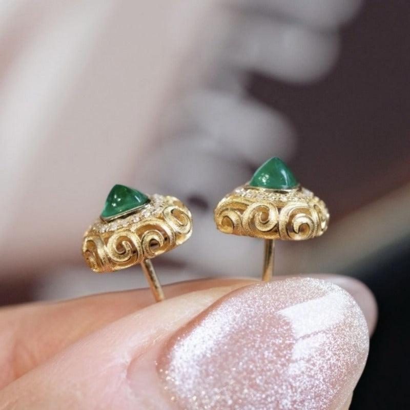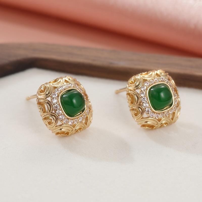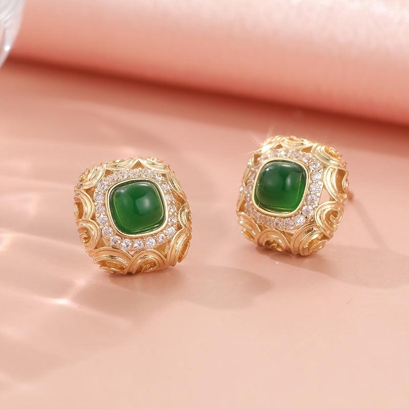 These golden plated copper stud earrings feature green synthetic zirconia, providing a classic retro look. They are perfect for daily wear and make an ideal gift for mothers.