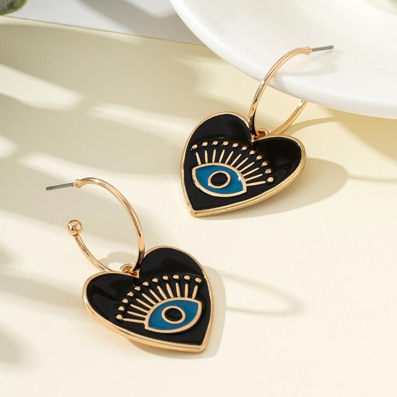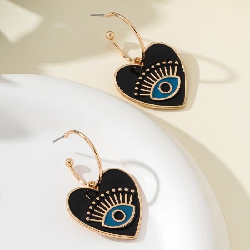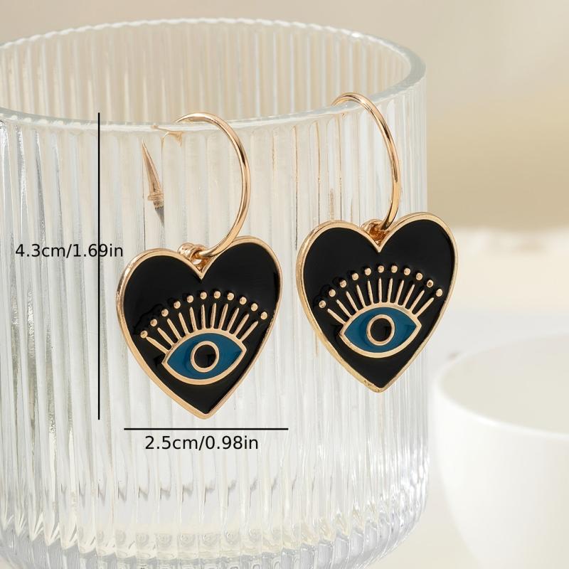 These dangle earrings feature a heart shape design with eye patterns. Perfect gift for women.