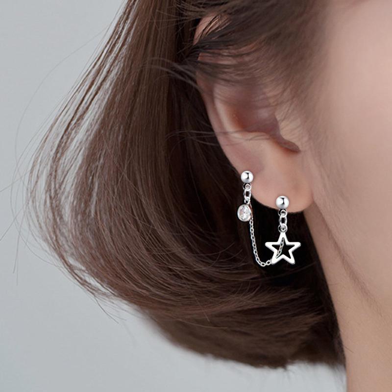 Stylish stainless steel earrings with double hole design featuring artificial Zirconia pendant and hollow star chain.
