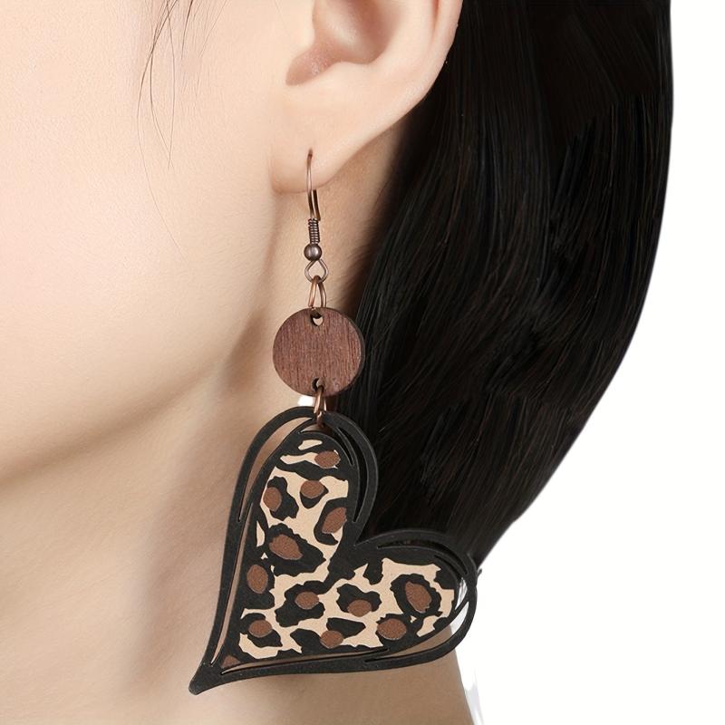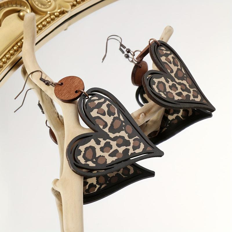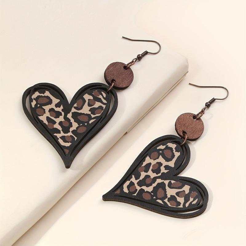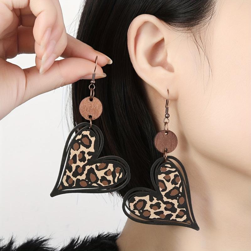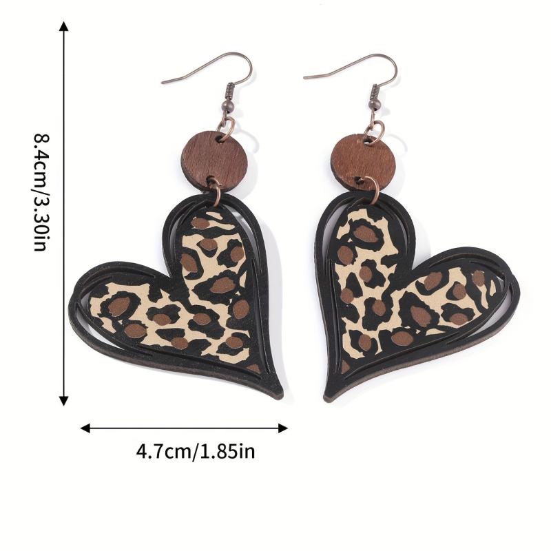 Vintage style heart-shaped drop earrings with leopard print design, made of wood and stainless steel hooks. Perfect for women and girls to wear daily or to parties.