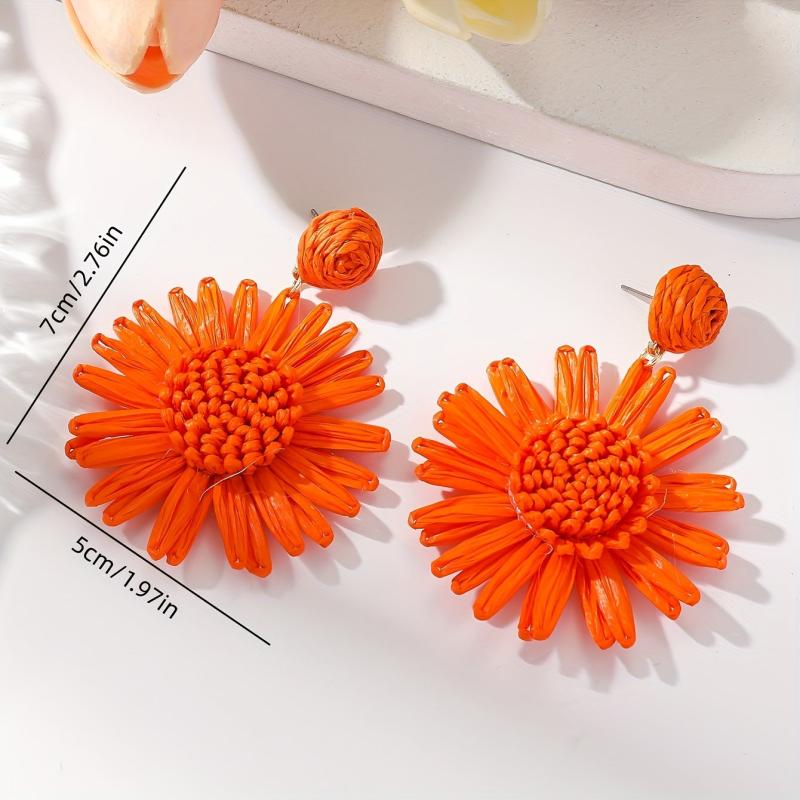These Bohemian beach vacation earrings feature handwoven raffia grass with a floral dangle design. The beige natural texture is perfect for everyday wear as well as special occasions.