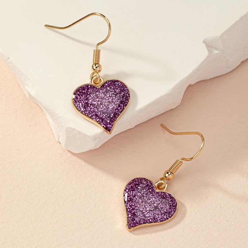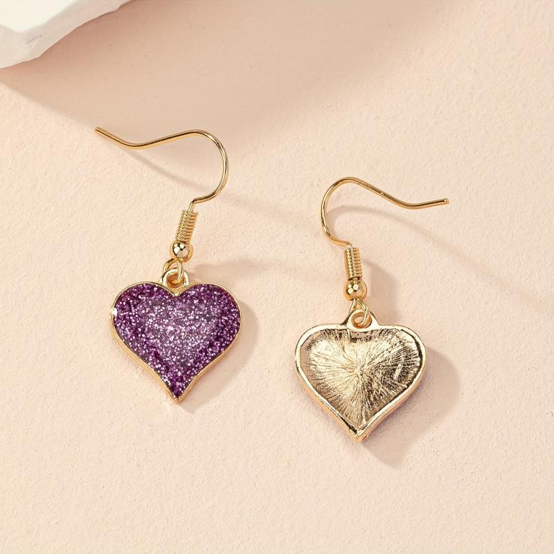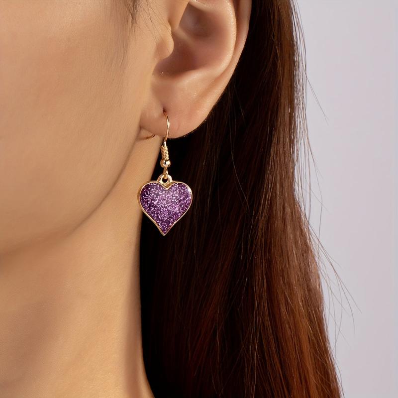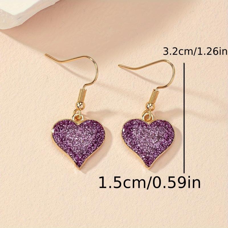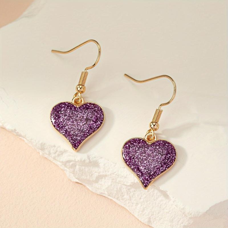 Add a touch of sparkle to your look with these playful purple glitter heart earrings. The golden tone zinc alloy dangle earrings feature sparkling crystals for a glamorous touch. Perfect for daily wear or special occasions.