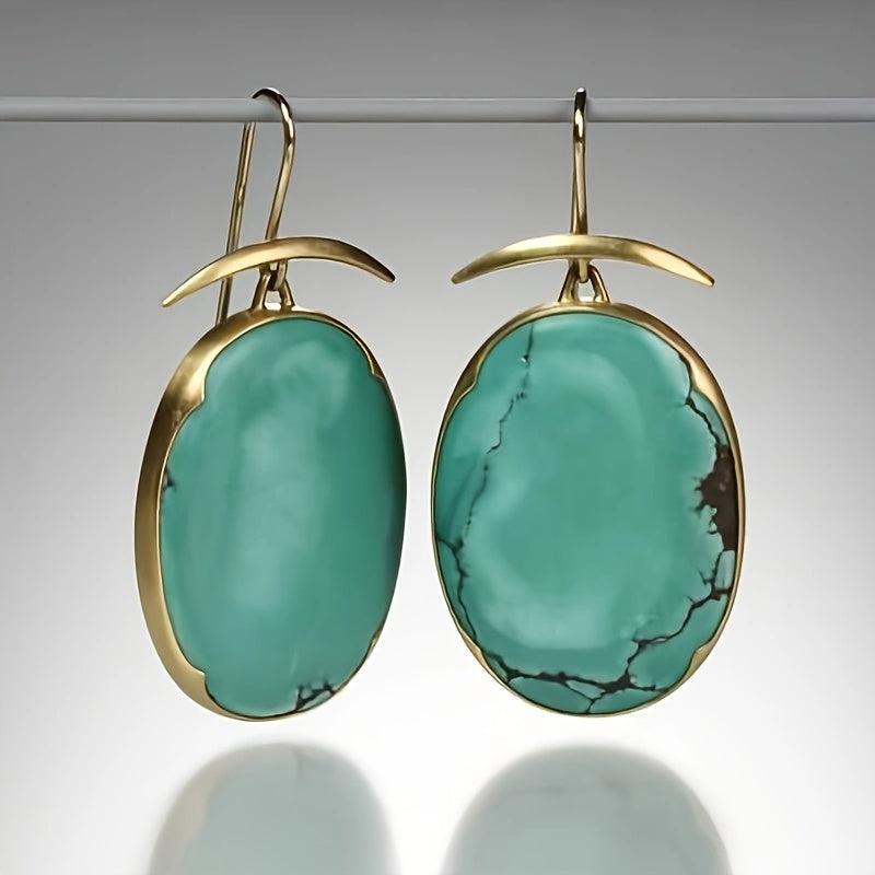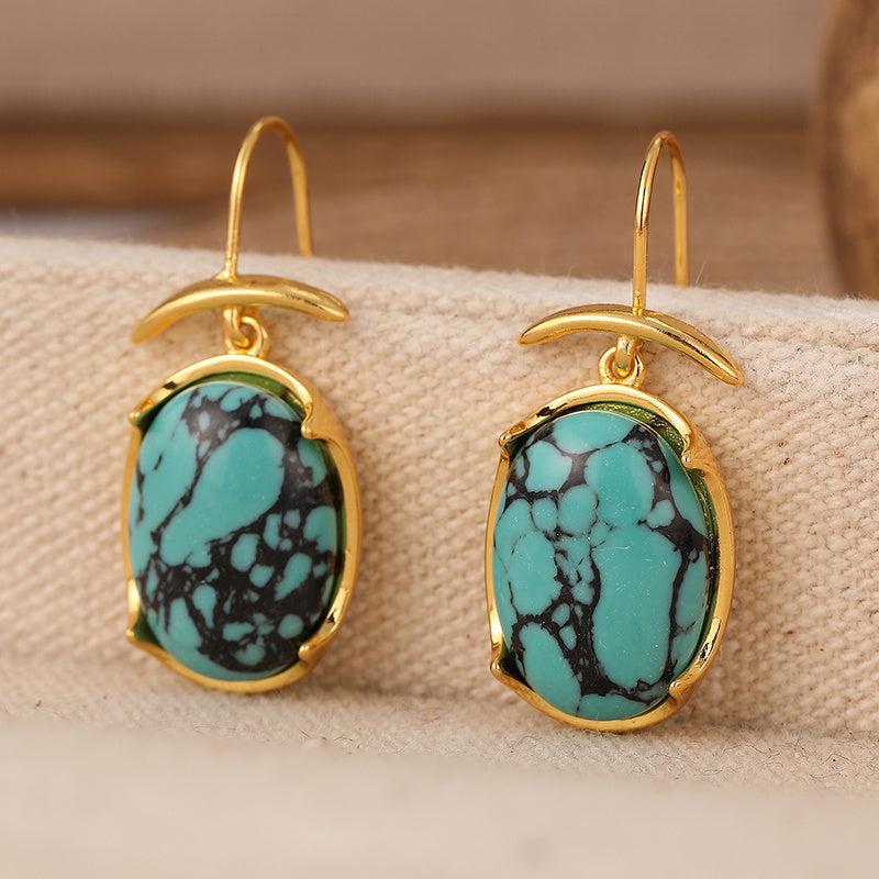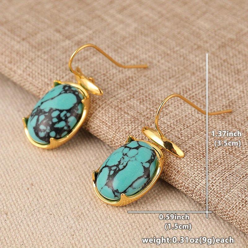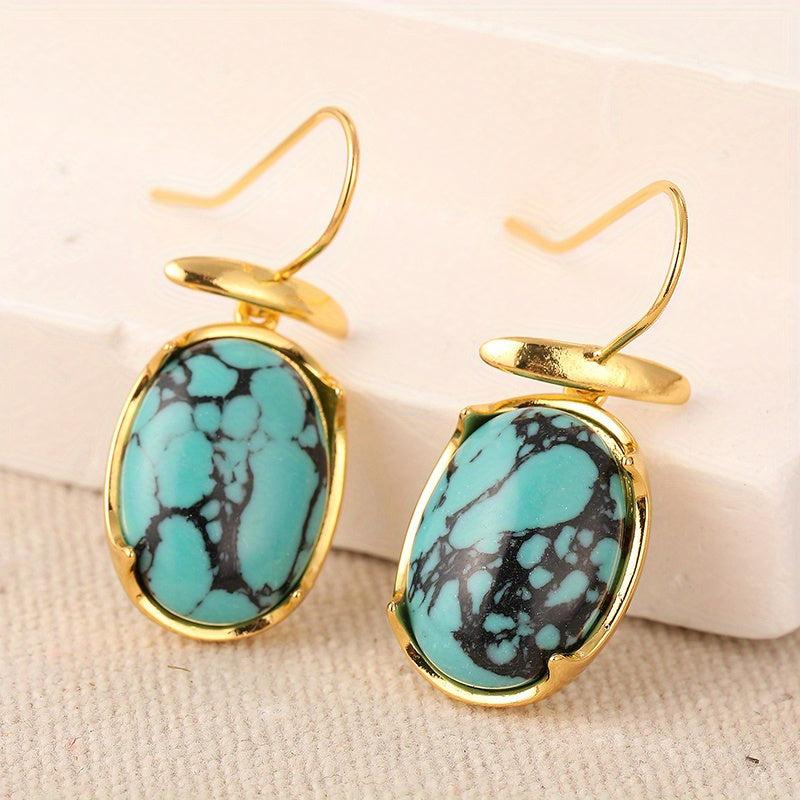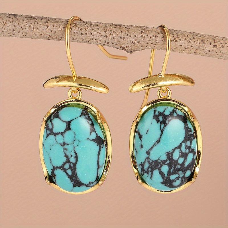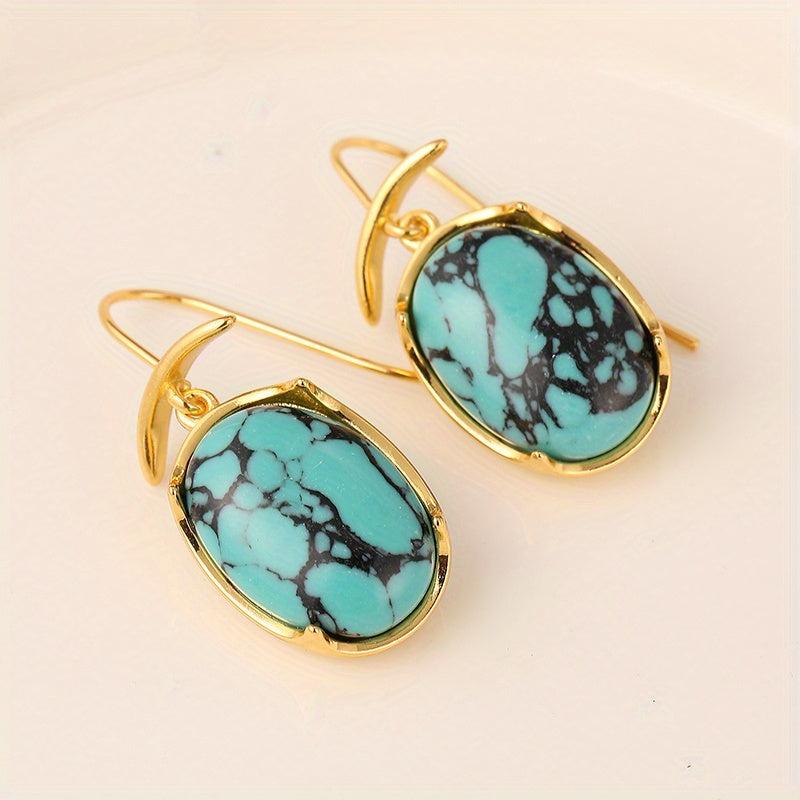 Elegant and lightweight earrings with synthetic turquoise in egg shape featuring intricate veining patterns. Perfect for parties or vacation wear. Great gift for women.