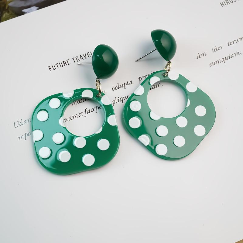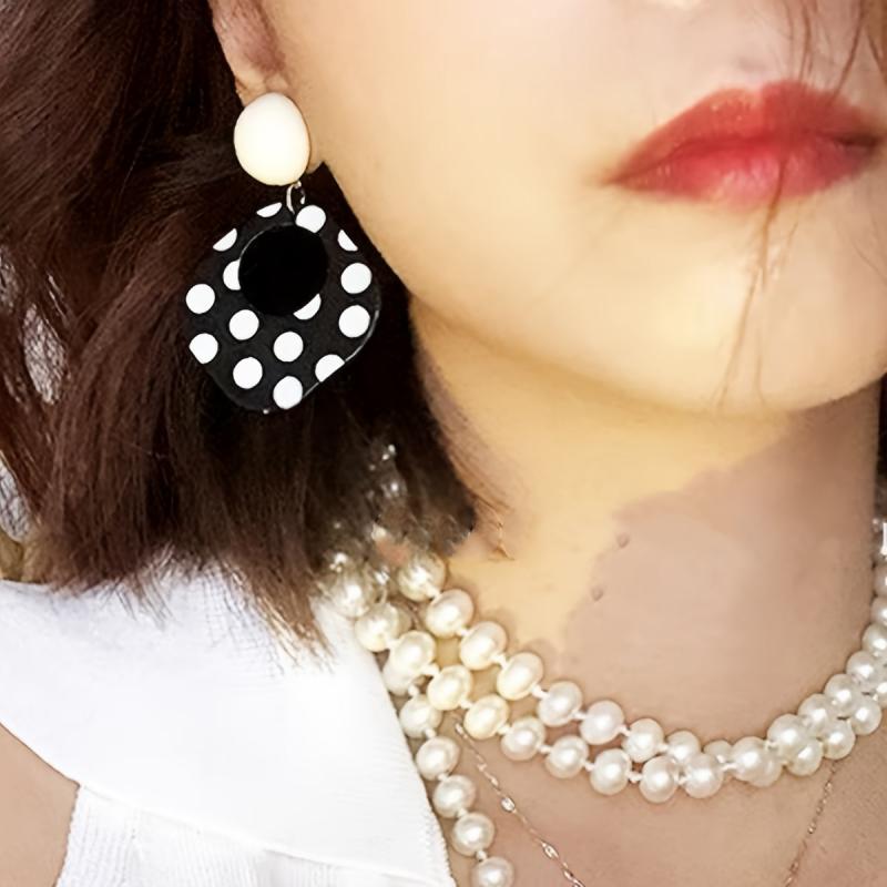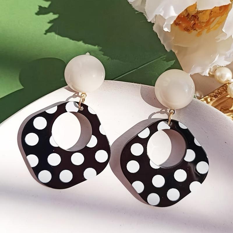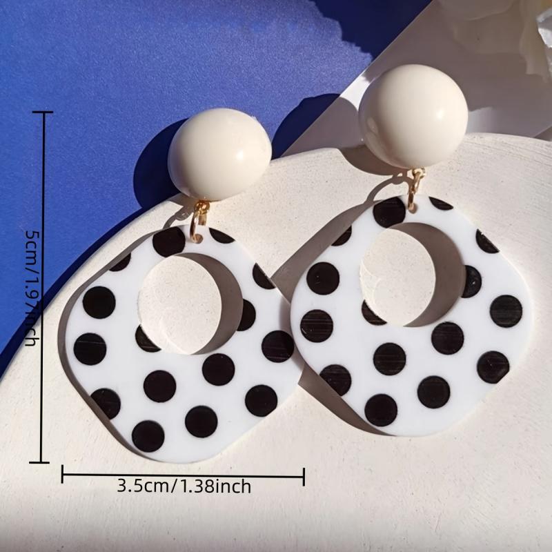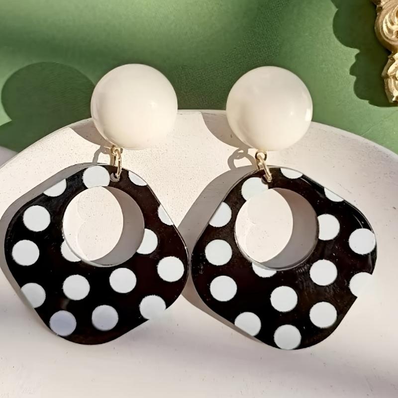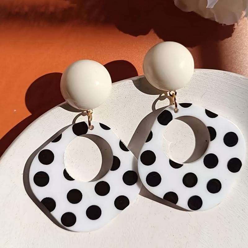 Elevate your look with these retro style dangle earrings featuring a polka dot design. Make a statement with these eye-catching accessories.