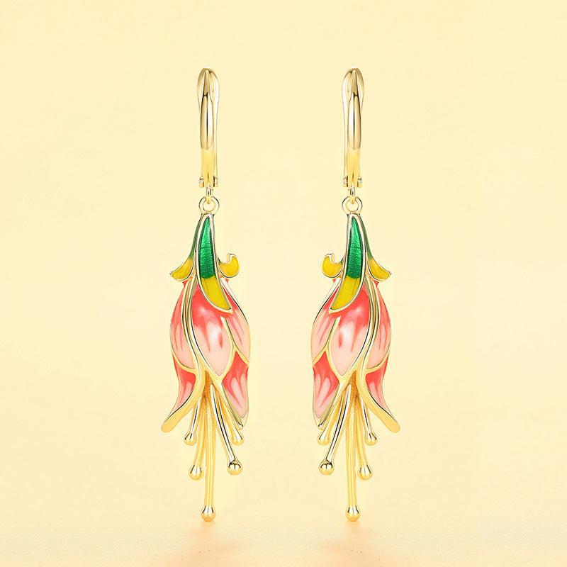 Beautiful rustic floral dangle earrings featuring colorful drip flower pendants made of KC golden plated copper, perfect for weddings and spring vacations.