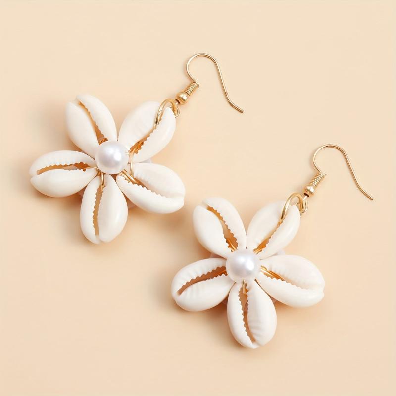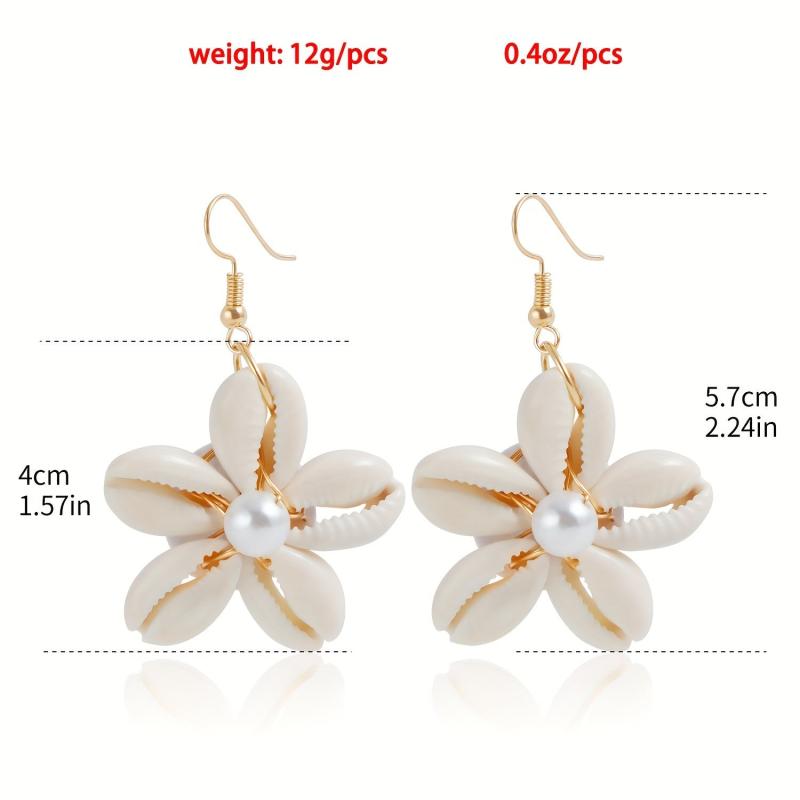 Embrace the ocean beach vibe with these stylish drop earrings featuring shell flowers and golden accents. Perfect for daily wear or accessorizing your beach dress.