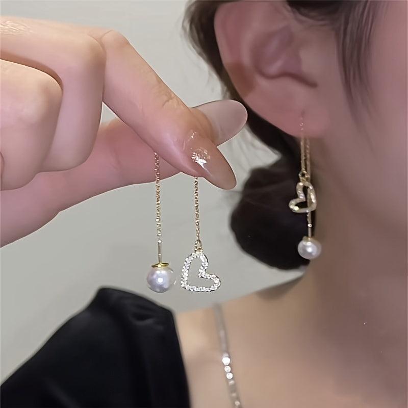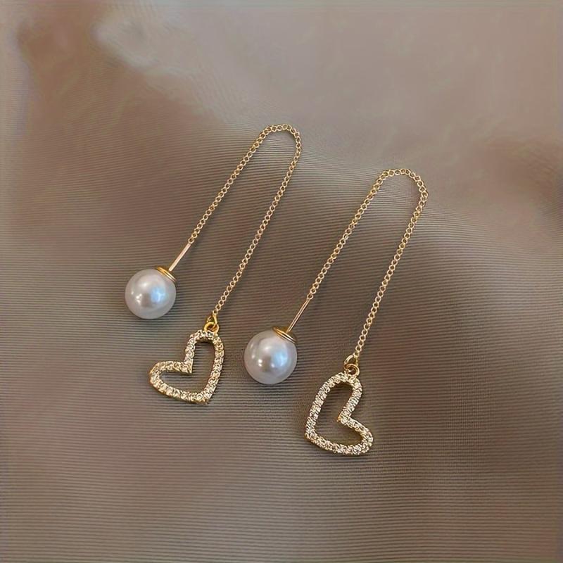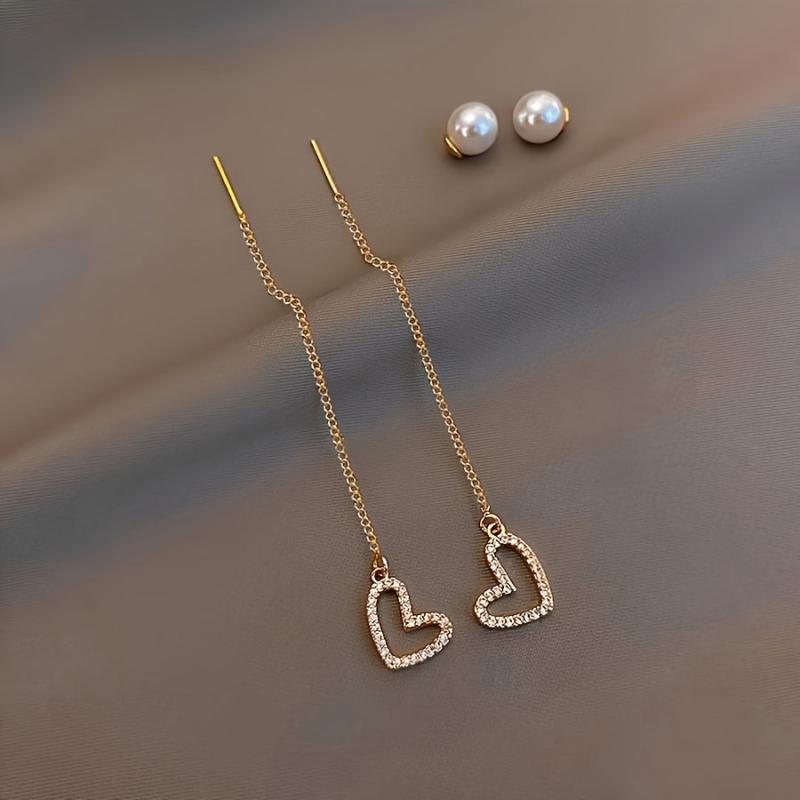 Add a touch of glam to your casual attire with these rhinestone heart drop earrings. Made with high-quality alloy and stainless steel posts, these earrings are perfect for everyday wear.