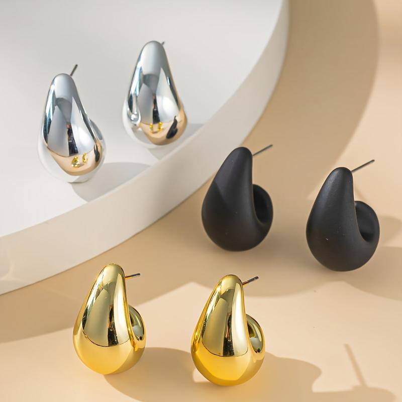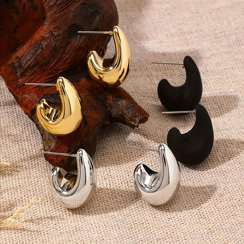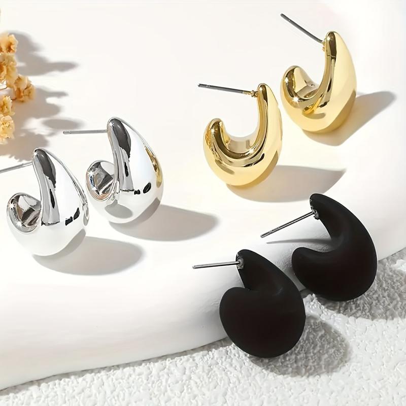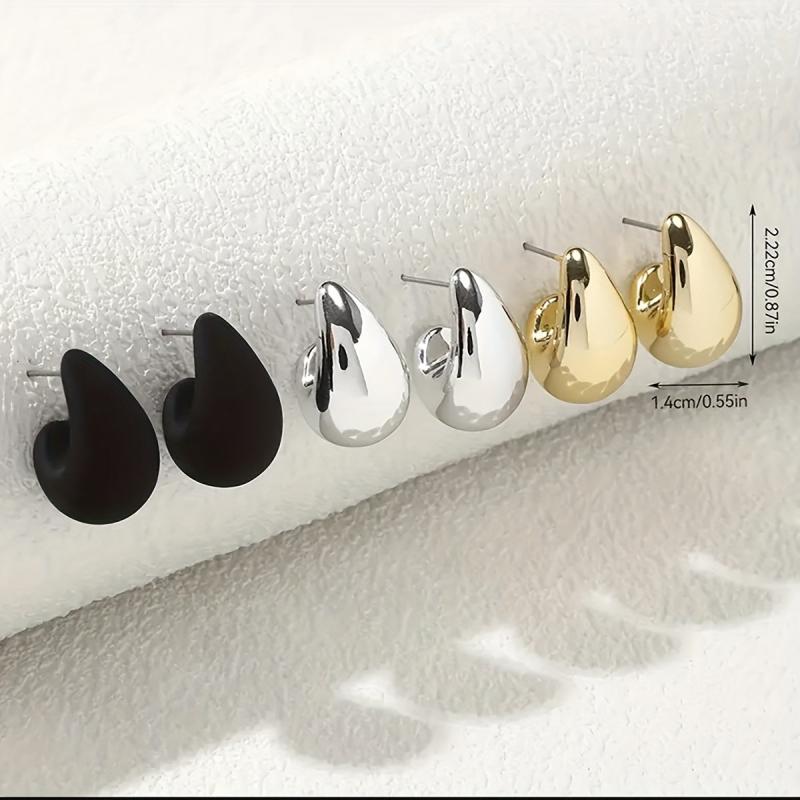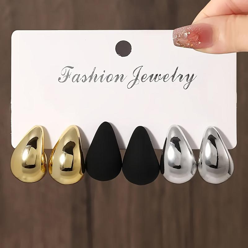 Elevate your everyday look with this set of three pairs of stylish teardrop earrings in different colors. Perfect for casual wear and adding a pop of color to your outfit.