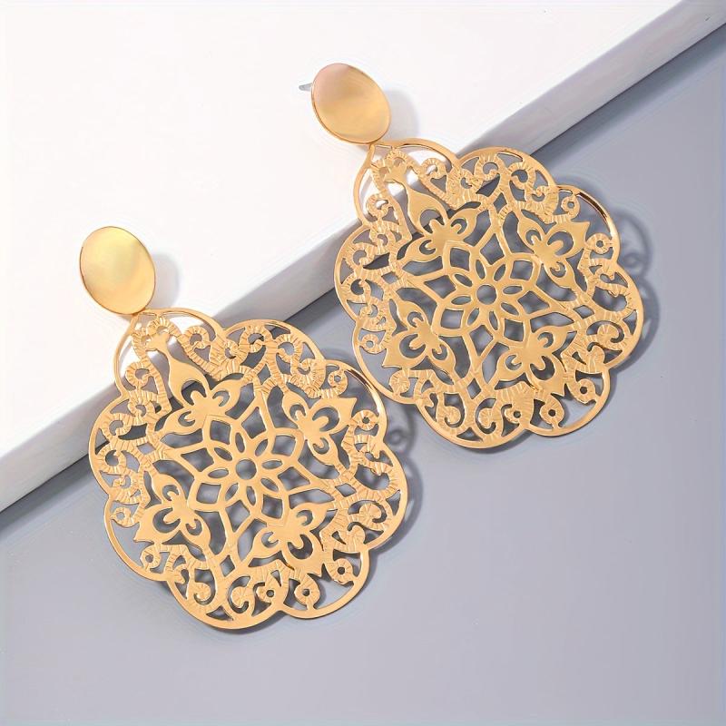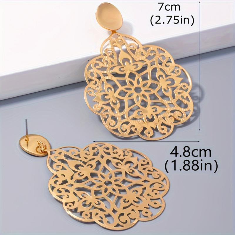 These bohemian-inspired golden tone filigree drop earrings feature intricate hollow floral designs, ideal for both casual attire and party outfits. Add a quirky touch to your look!