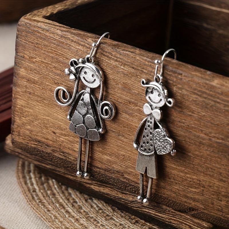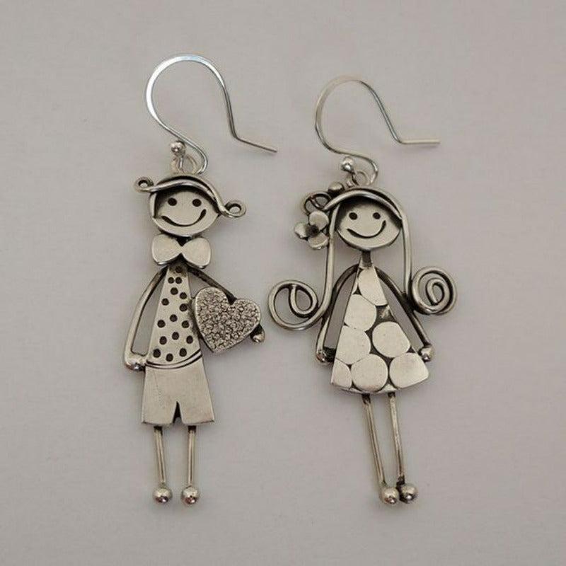 Adorable vintage boho style earrings featuring a charming boy and girl holding hands design. Made of nickel 925 silvery plated zinc alloy, ideal for daily wear or gifting, perfect Christmas gift.