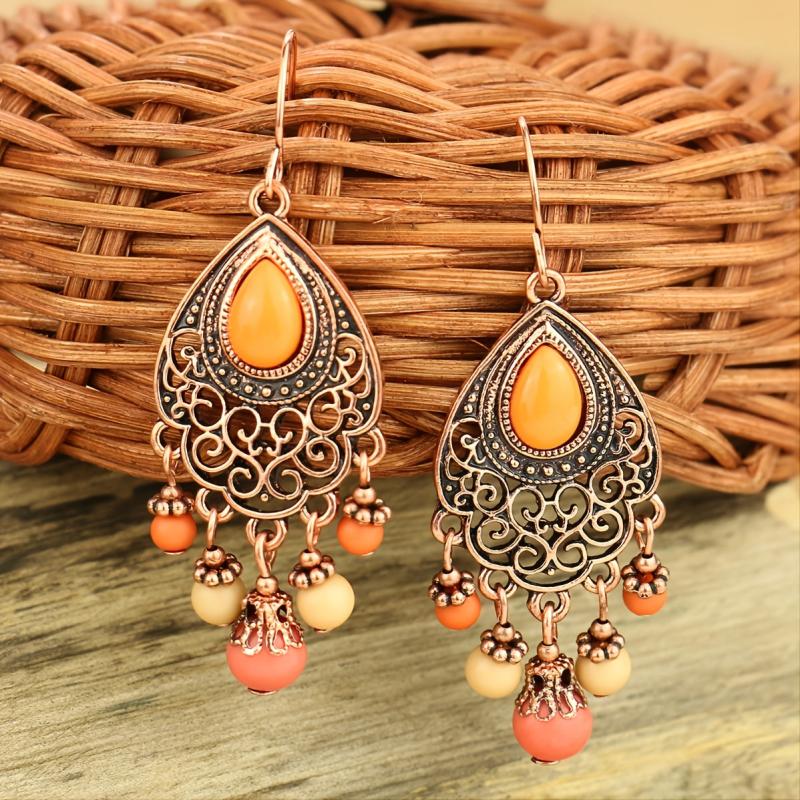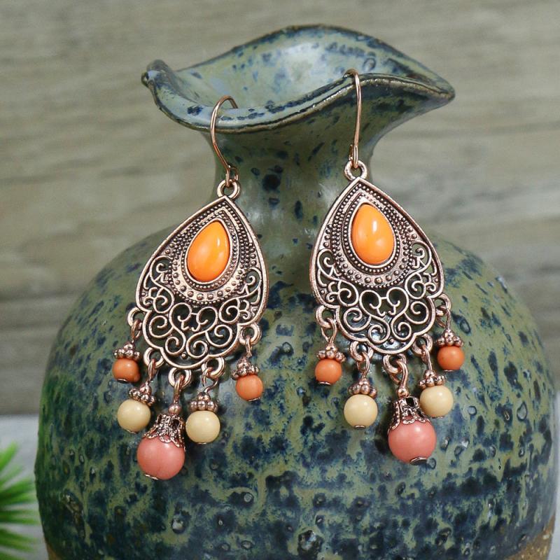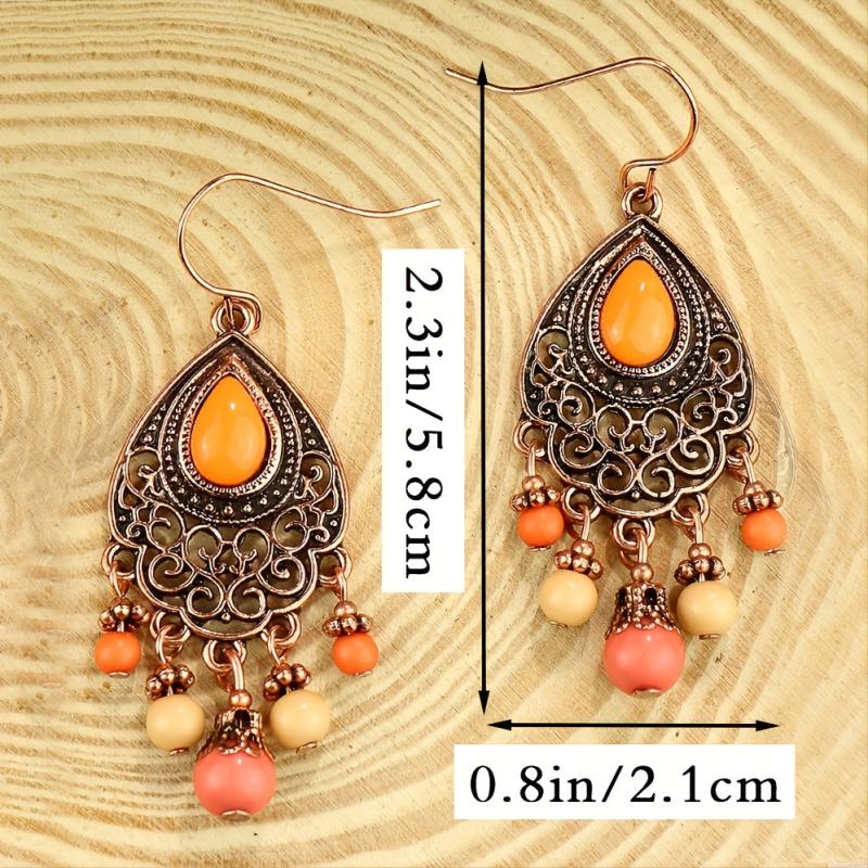 These vintage-inspired earrings feature guipure geometric cut outs, charming pine stones, and beaded tassels for a unique and stylish look.
