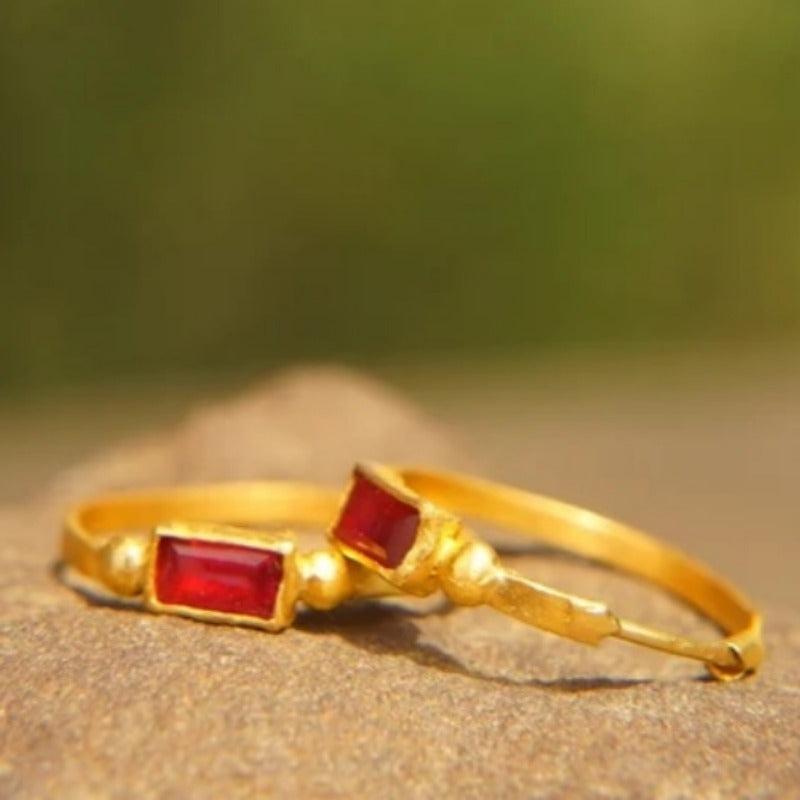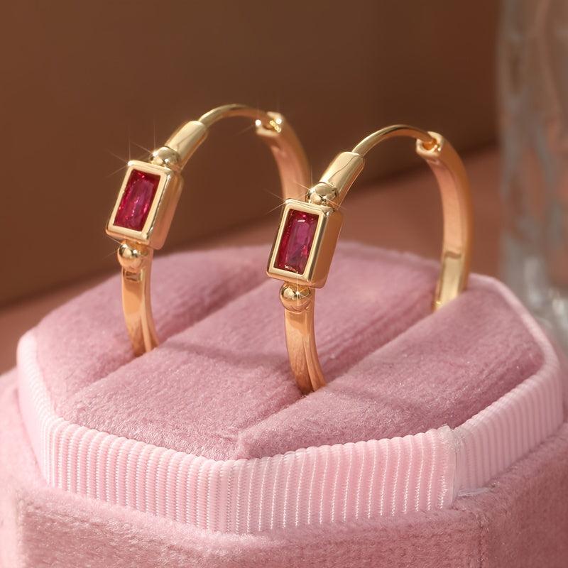 Add a touch of bohemian style to your look with these artisan-crafted hoop earrings. They feature rose red zirconia stones and a golden tone finish, perfect for daily wear or special occasions.