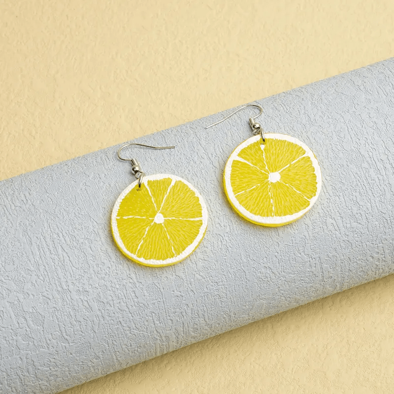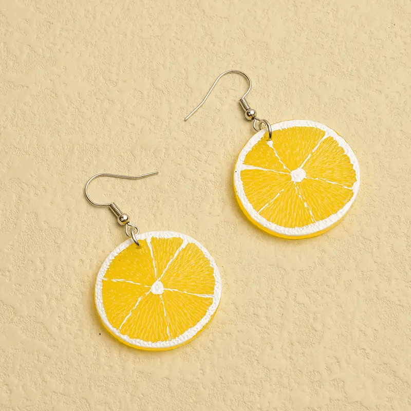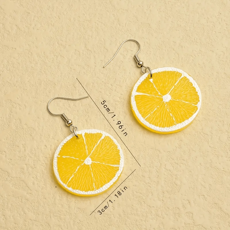 Add a pop of color to your outfit with these fun lemon slice dangle earrings! These boho style earrings feature copper hooks and a plastic body, making them perfect for daily wear or parties.
