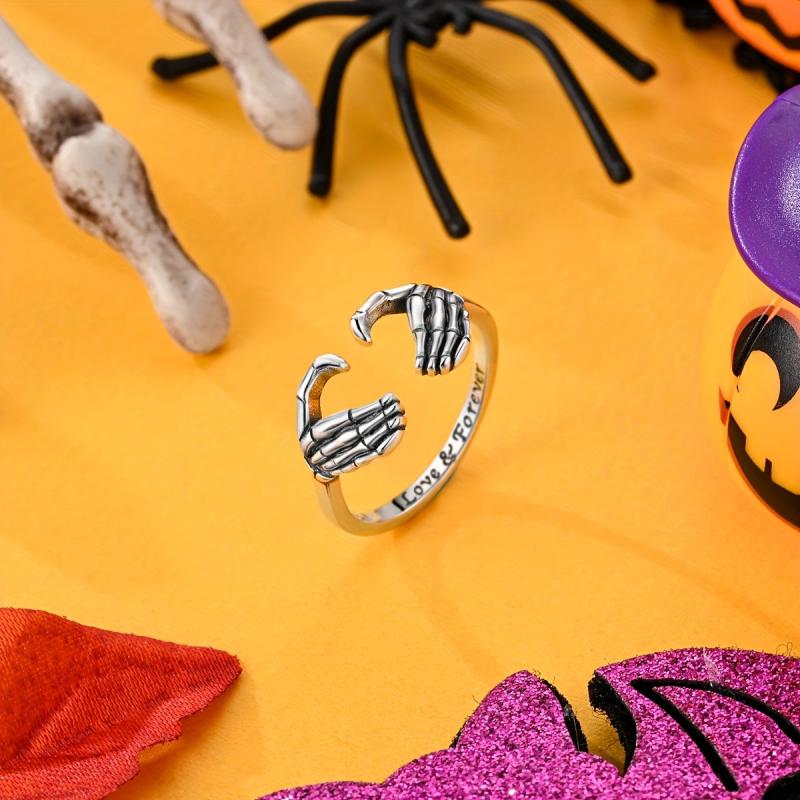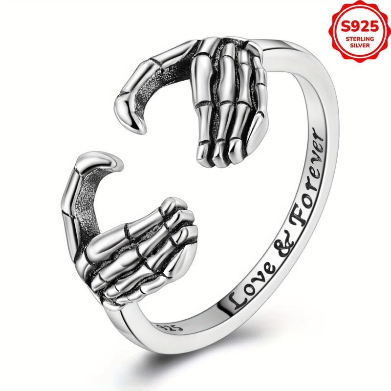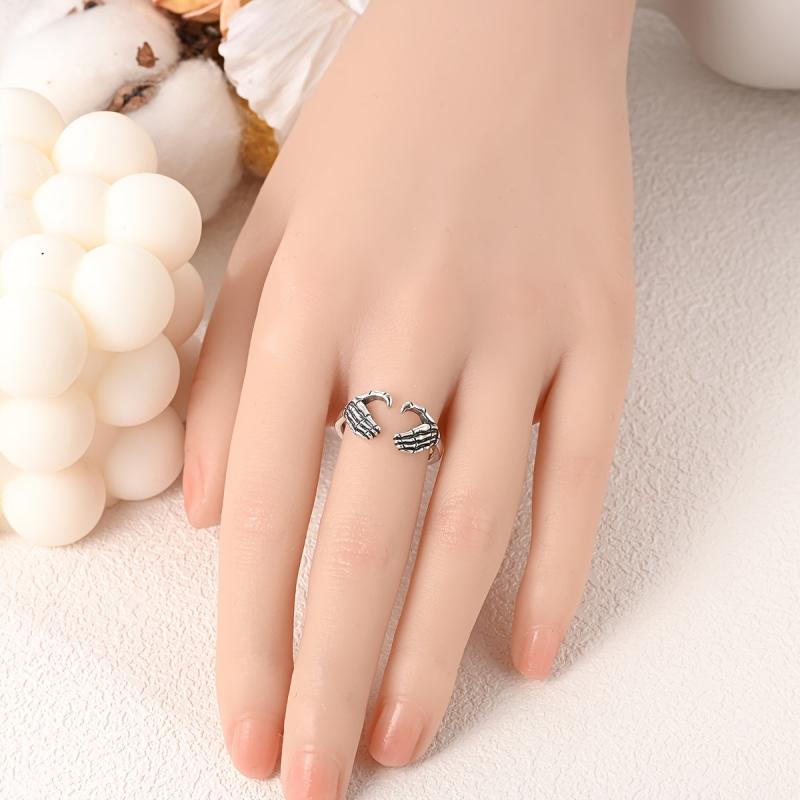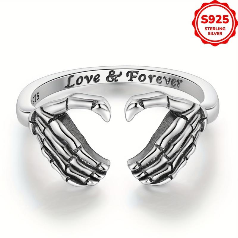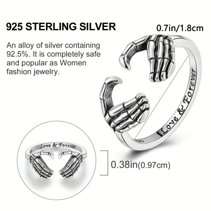 This 925 sterling silver ring features a unique design with a skull, hand, and heart motif, perfect for adding a touch of edgy style to any outfit. It is adjustable to fit most finger sizes and makes a great gift for weddings, engagements, birthdays, and other special occasions.